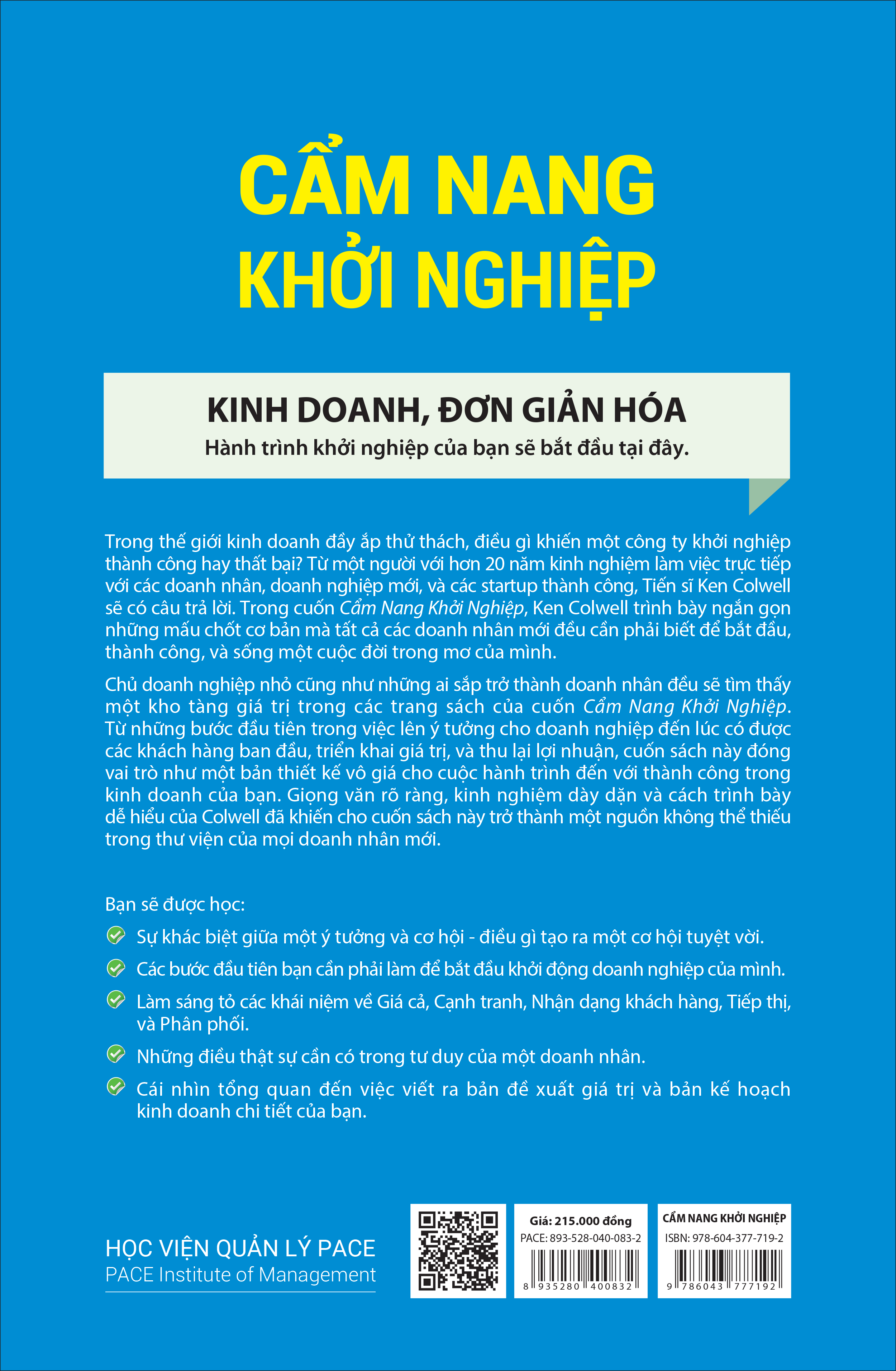 Cho dù bạn đang trong trường hợp nào đi nữa thì cuốn sách này là dành cho bạn. Đây là một cuốn cẩm nang bao gồm tất cả các bước cơ bản cho những ai chuẩn bị bước chân vào khởi nghiệp hoặc cho các chủ doanh nghiệp vừa và nhỏ cần nhìn nhận lại công việc kinh doanh của mình. Được viết bởi một người thầy, một chuyên gia với hơn 20 năm kinh nghiệm trong lĩnh vực khởi nghiệp, Tiến sĩ Ken Colwell sẽ giúp bạn xây dựng được một tư duy đúng đắn và chiến lược phù hợp cho doanh nghiệp của bạn.