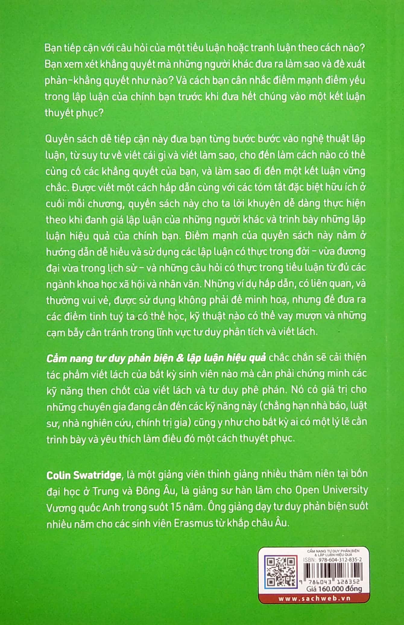 Quyển sách dễ tiếp cận này đưa bạn từng bước từng bước vào nghệ thuật lập luận, từ suy tư về viết cái gì và viết làm sao, cho đến làm cách nào có thể củng cố các khẳng quyết của bạn, và làm sao đi đến một kết luận vững chắc. Được viết một cách hấp dẫn cùng với các tóm tắt đặc biệt hữu ích ở cuối mỗi chương, quyển sách này cho ta lời khuyên dễ dàng thực hiện theo khi đánh giá lập luận của những người khác và trình bày những lập luận hiệu quả của chính bạn. Điểm mạnh của quyển sách này nằm ở hướng dẫn dễ hiểu và sử dụng các lập luận có thực trong đời – vừa đương đại vừa trong lịch sử - và những câu hỏi có thực trong tiểu luận từ đủ các ngành khoa học xã hội và nhân văn. Những ví dụ hấp dẫn, có liên quan, và thường vui vẻ, được sử dụng không phải để minh họa, nhưng để đưa ra các điểm tinh túy ta có thể học, kỹ thuật nào có thể vay mượn và những cạm bẫy cần tránh trong lĩnh vực tư duy phân tích và viết lách.