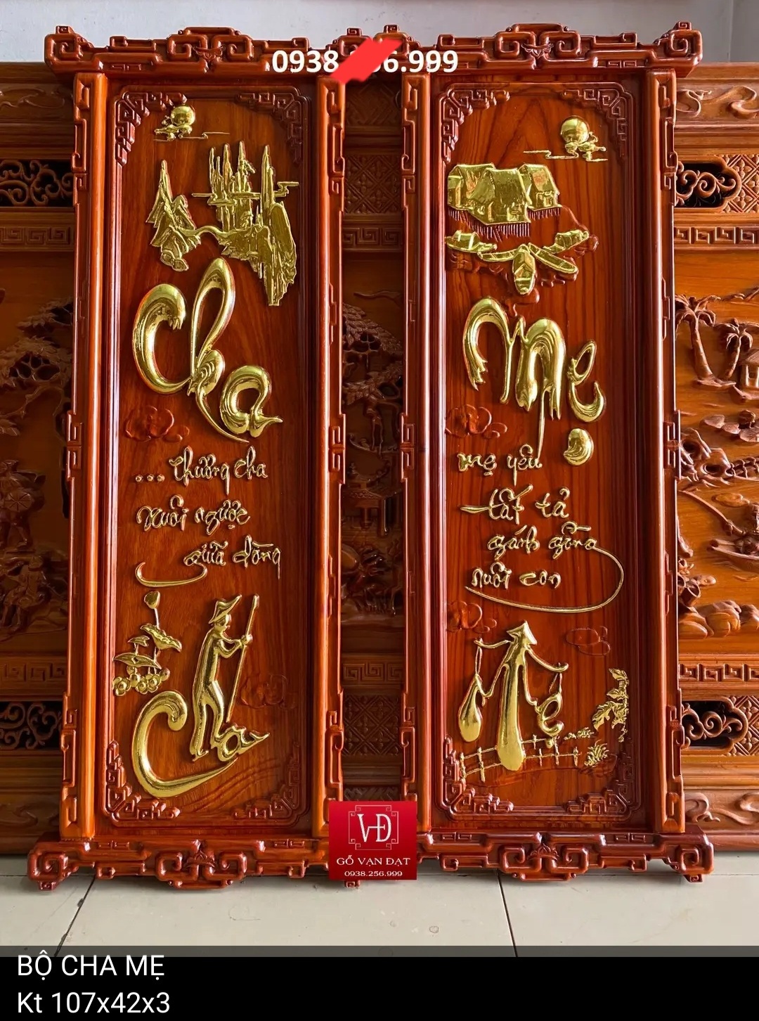Cặp tranh câu đối khắc chữ cha mẹ được làm bằng chất liệu gỗ hương đỏ tự nhiên 100% Kt 42×107×3cm _ Cặp tranh câu đối được điêu khắc trạm trổ vô cùng tỉ mỉ ,Tinh sảo kỳ công .Đi hầu hết tất cả mọi chi tiết góc ngách nội dung hoa văn của tranh đều được gọt tỉa chỉnh sửa sắc nét hoàn toàn bằng tay thủ công .Đồng thời tranh được kiểm định kỹ lưỡng khắt khe ,Như cho vào thẩm sấy cho gỗ khô kiệt .Mục đích trống dập nứt vênh mo mối mọt ,kết hợp với trà nhám ,đánh giấy giáp nhiều nước sờ mát lạnh .Song rồi cho vào phun lót làm bóng mờ để giữ lại mầu sắc vân gỗ tự nhiên .Cũng như sơn son dát vàng cao cấp như ảnh trên .Cặp câu đối được làm và hoàn thiện ,do bàn tay khối óc tài hoa .Từ những người thợ dầy rặn kinh nghiệm cũng như tay nghề cao trong làng nghề truyền thống .Chính vì thế cặp tranh câu đối bằng gỗ hương đã đáp ứng đầy đủ mọi tiêu trí cần thiết như ( Đẹp bền rẻ ) Thẩm mỹ nghệ thuật với chất lượng tuyệt vời