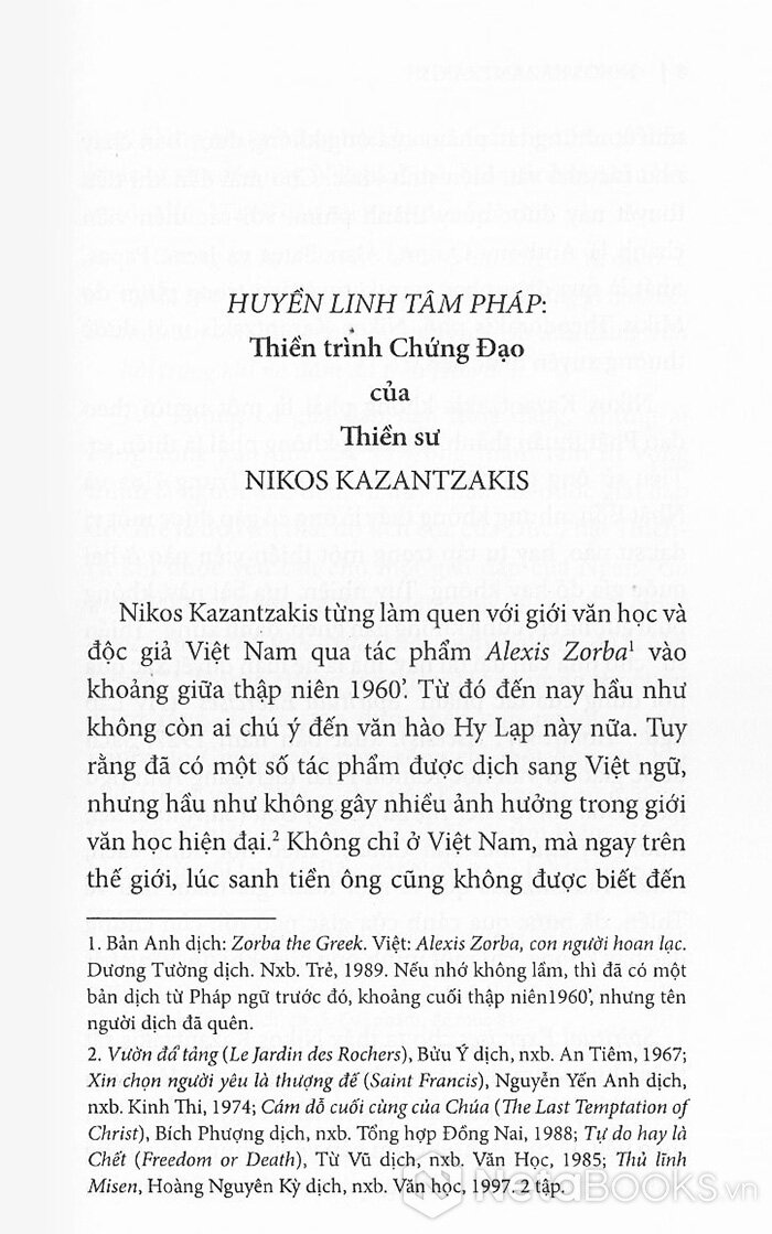 - Huyền Linh Tâm Pháp (bìa cứng) Tác giả: Nikos Kazantzaki Dịch giả: Tuệ Hạnh & Phật Điển Hành Tư Ngôn ngữ: Tiếng Việt Năm xuất bản: 2022 Số trang: 364 Nhà phát hành: Cửu Đức Nhà xuất bản: Hồng Đức Kích thước: 15.3 x 21 cm Loại bìa: Bìa cứng HUYỀN LINH TÂM PHÁP - Tác giả: Nikos Kazantzakis (QUYỂN THÁNH KINH CỦA VĂN HỌC HẬU HIỆN ĐẠI) Một tác phẩm vĩ đại về Chúa - một cuộc kiếm tìm Chúa và Tánh linh (phần linh hiển trong con người). 'Con người phải đấu tranh với Chúa để được thánh hóa, và như thế là cứu Chúa bằng cách nhìn nhận sự hiện hữu của Ngài trên con đường diệt tận Ngài.' - Racheotes, Nocholoas S 'Mục đích tối thượng của cuộc đấu tranh - hợp nhất làm Một với Chúa - chính là cuộc thăng hoa mà Ki-tô đã đi qua, cuộc thăng hoa mà Ngài cũng mời chúng ta phải tự đi, đi theo dấu vết đẫm đầy máu của Ngài' - Report to Greco Thông tin tác giả: Nikos Kazantzaki được biết đến trên toàn thế giới với bộ phim chuyển thể từ cuốn tiểu thuyết “Zorba The Greek”. Tuy nhiên, ông còn nổi tiếng với nhiều lĩnh vực khác. Trước hết, ông sáng tác tất cả các thể loại văn học: thơ, kịch, tiểu thuyết, sách trẻ em, truyện du lịch, tiểu luận, tác phẩm dịch, phóng sự… Hơn nữa, ông còn là một người bạn của nước Pháp vì đã học tập tại một trường học trên đảo Naxos (Pháp), rồi theo học các lớp của Henri Bergson tại trường Collège de France tại Pháp. Ông đã thể hiện tình yêu của mình đặc biệt với văn hoá Pháp qua hai cuốn sách bằng tiếng Pháp về quãng thời gian ông sống ở Paris, rồi sau đó là quãng đời ở Antibes sau thế chiến thứ hai cho đến khi qua đời… Rốt cuộc ông kiếm tìm điều cốt yếu ở con người và xã hội, tình yêu thiên nhiên, các giá trị nhân văn và sự xích lại gần nhau giữa các dân tộc và các nền văn hoá. Nikos Kazantzaki sinh ra ở Crete năm 1883, học Luật và nhận bằng Tiến sĩ Luật tại Đại học Tổng hợp Athens. Sau đó ông sang Paris học tập dưới sự hướng dẫn của triết gia Henri Bergson, và sau đó ông còn tiếp tục học văn chương và nghệ thuật bốn năm nữa ở Đức và Ý. Năm 1945, ông trở thành Bộ trưởng Bộ giáo dục của Hy Lạp, và là Chủ tịch của Hội Nhà văn Hy Lạp. Nikos Kazantzaki qua đời vào ngày 26 tháng 10 năm 1957, hưởng thọ 74 tuổi. Được đưa về Athènes nhưng giáo hội chính thống giáo tại đây đã trục xuất ông khỏi đạo và thi hài ông được di chuyển về Iraklion, Crète. Tại giáo đường Agios Minas nghi lễ được cử hành, một đám rước vĩ đại tiếp diễn sau đó thi hài ông được mai táng trong một lăng tẩm kiểu Ai Cập, nơi thành lũy Venezia cũ, phía trên cao của Iraklion. Lăng mộ nơi ông yên nghỉ không ghi khắc tên tuổi hay ngày tháng mà duy nhất chỉ một bức mộ chí với hàng chữ mà ông đã căn dặn trước khi nhắm mắt.