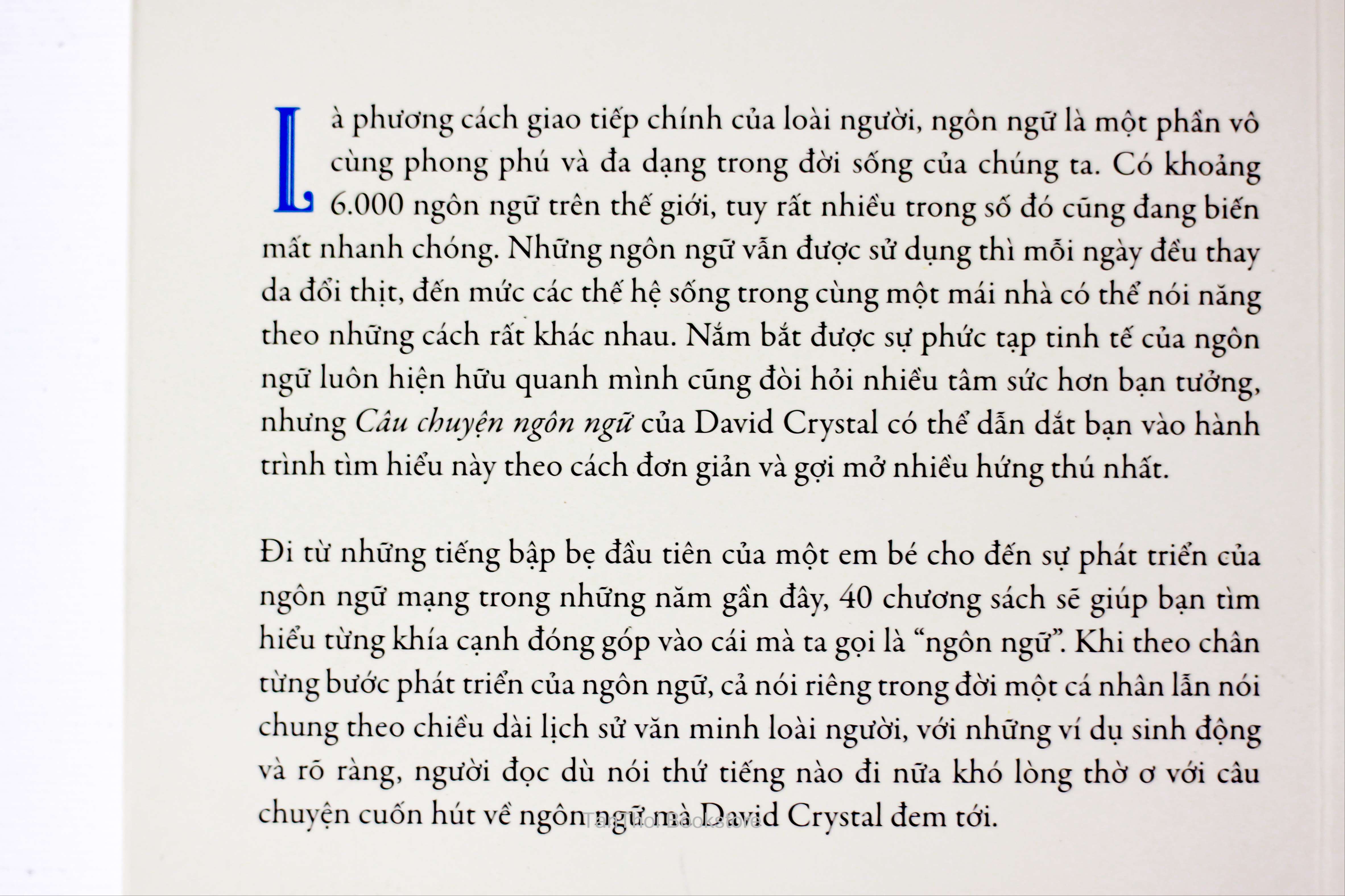 ��Đi từ những tiếng bập bẹ đầu tiên của một em bé cho đến sự phát triển của ngôn ngữ mạng trong những năm gần đây, 40 chương sách sẽ giúp bạn tìm hiểu từng khía cạnh đóng góp vào cái mà ta gọi là “ngôn ngữ”. Khi theo chân từng bước phát triển của ngôn ngữ, cả nói riêng trong đời một cá nhân lẫn nói chung theo chiều dài lịch sử văn minh loài người, với những ví dụ sinh động và rõ ràng, người đọc dù nói thứ tiếng nào đi nữa cũng không thể thờ ơ với câu chuyện cuốn hút về ngôn ngữ trong cuốn sách này.