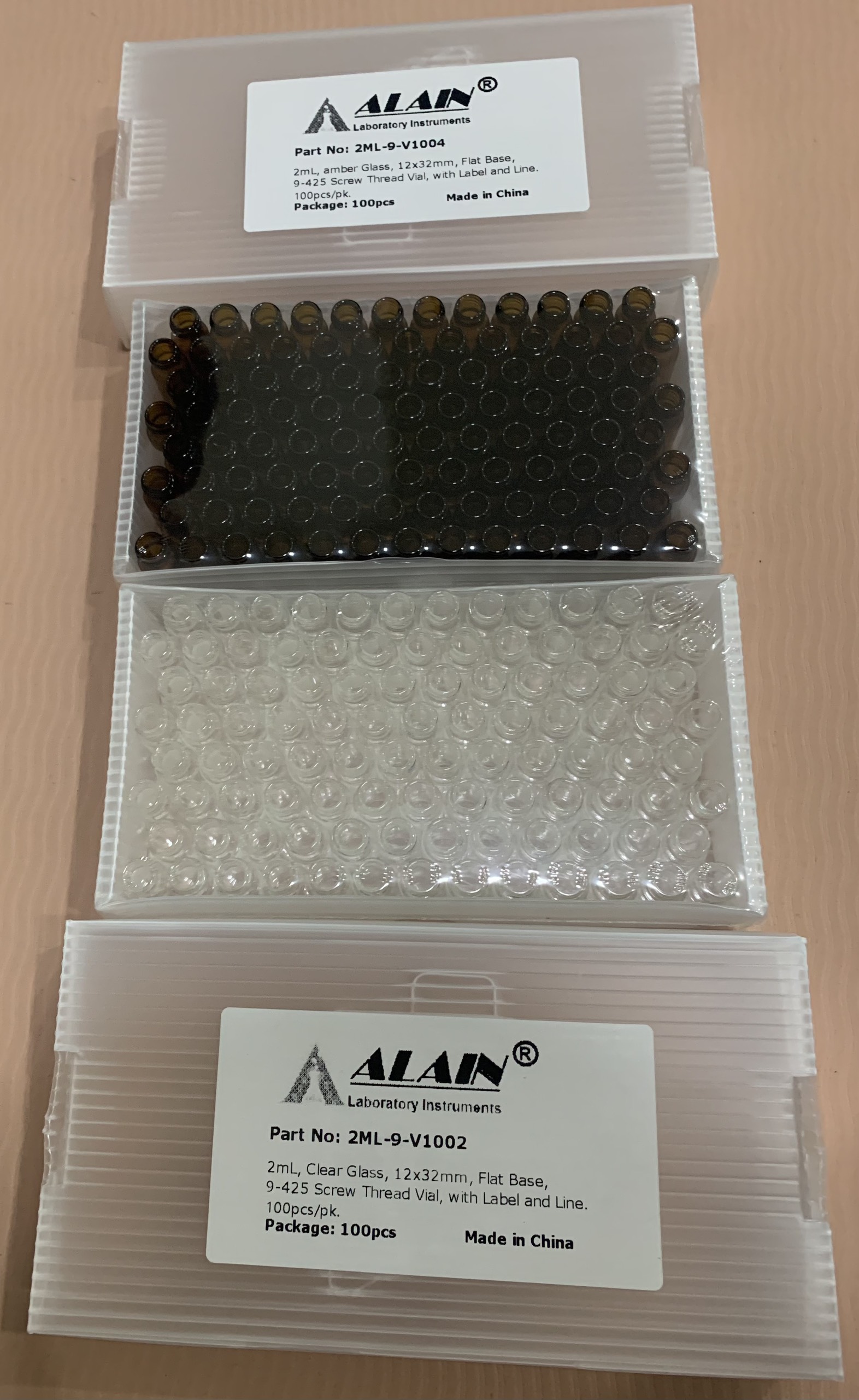 - Phân loại: +) Chai thủy tinh 1.5ml (2ml) trắng chia vạch và label, Nắp vặn xanh 9mm, 9-425 đệm septa Silicone white/PTFE red không xẽ rãnh, 100c/hộp, mã 2ML-9-V1002 & 9-SP3002-2A +) Chai thủy tinh nâu 1.5ml (2ml) chia vạch và label, Nắp vặn xanh 9mm, 9-425 đệm septa Silicone white/PTFE red không xẽ rãnh, 100c/hộp, mã: 2ML-9-V1004 & 9-SP3002-2A +) Chai thủy tinh 1.5ml (2ml) trắng chia vạch và label, Nắp vặn xanh 9mm, 9-425 đệm septa Silicone white/PTFE Blue xẽ rãnh I, 100c/hộp, mã: 2ML-9-V1002 & 9-SP3006-2A +) Chai thủy tinh nâu 1.5ml (2ml) chia vạch và label, Nắp vặn xanh 9mm, 9-425 đệm septa Silicone white/PTFE Blue xẽ rãnh I, 100c/hộp, mã: 2ML-9-V1004 & 9-SP3006-2A +) Chai thủy tinh nâu 1.5ml (2ml) chia vạch và label, Nắp vặn Kín xanh 9mm, 9-425 đệm septa Silicone white/PTFE red 100c/hộp, mã: "2ML-9-V1004 & 9-SP3002-1C +) Chai thủy tinh 1.5ml (2ml) trắng chia vạch và label, Nắp vặn Kín xanh 9mm, 9-425 đệm septa Silicone white/PTFE red , 100c/hộp, mã: 2ML-9-V1002 & 9-SP3002-1C