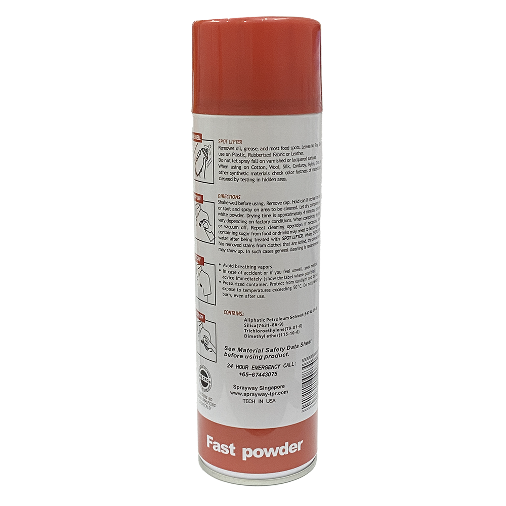 Độ tẩy trung bình trên vải.Nhanh khô và có mùi thơm.Hiệu quả an toàn đối với các loại vải như len, bông, lụa, sợi tổng hợp và các loại vải nhạy cảm.Chuyên tẩy các vết dầu và vết bẩn trên bề vải của may, xịt tẩy dễ dàng mà không làm ảnh hưởng đến màu vải. Tiện lợi cho các bạn thợ may. Hướng dẫn sử dụng : Xoay mũi tên chỗ bấm xịt đến vị trí đánh dấu mực để mở voan xịt. Lắc đều hướng lên xuống, xịt vào vết bẩn phù kín vết bẩn, sau khoảng 20 phút sẽ khô lớp bột, sau đó phủi sạch lớp bột khô các vết bẩn sẽ không còn trên vải, không để lại vết ố, không cần rửa lại nước.