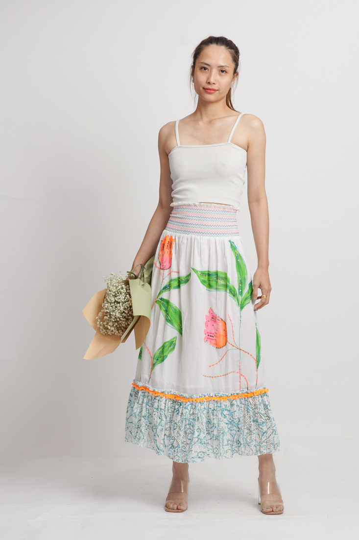 Chân Váy Boho Luna Llena, chất liệu voan lụa mềm mại cao cấp. Họa tiết thổ cẩm độc đáo kết hợp ánh kim nhẹ nhàng, nổi bật. Eo thun co giãn. Có lớp lót cotton