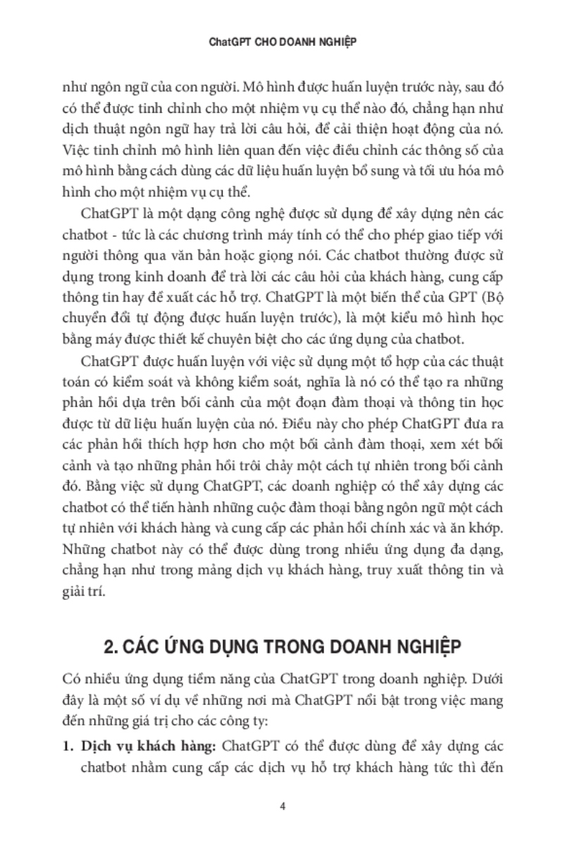 ChatGPT CHO DOANH NGHIỆP là một hướng dẫn cơ bản dành cho các cá nhân và doanh nghiệp, đặc biệt là nhóm những nhà khởi nghiệp, những người đang tìm kiếm một lợi thế để mở rộng kinh doanh nhanh hơn và linh hoạt hơn. Trong môi trường kinh doanh đầy cạnh tranh ngày nay, áp lực đè nặng lên các công ty, đặc biệt công ty khởi nghiệp, trong vận hành hay rủi ro thất bại. ChatGPT là một công nghệ đột phá mới, cho bạn quyền truy cập đến đầy đủ các bộ phận của tổ chức, bao gồm tài chính, phát triển sản phẩm, vận hành, tiếp thị và bán hàng, và dịch vụ khách hàng, mà không mất thêm chi phí hay làm gia tăng tốc độ đốt tiền của bạn. Đây là một cơ hội quá tốt không thể bỏ qua – đặc biệt lúc bạn lâm nguy hay khi bạn muốn mở rộng doanh nghiệp của mình nhanh hơn và hiệu quả hơn bao giờ hết!