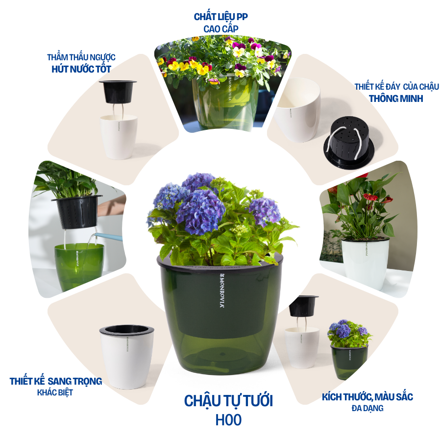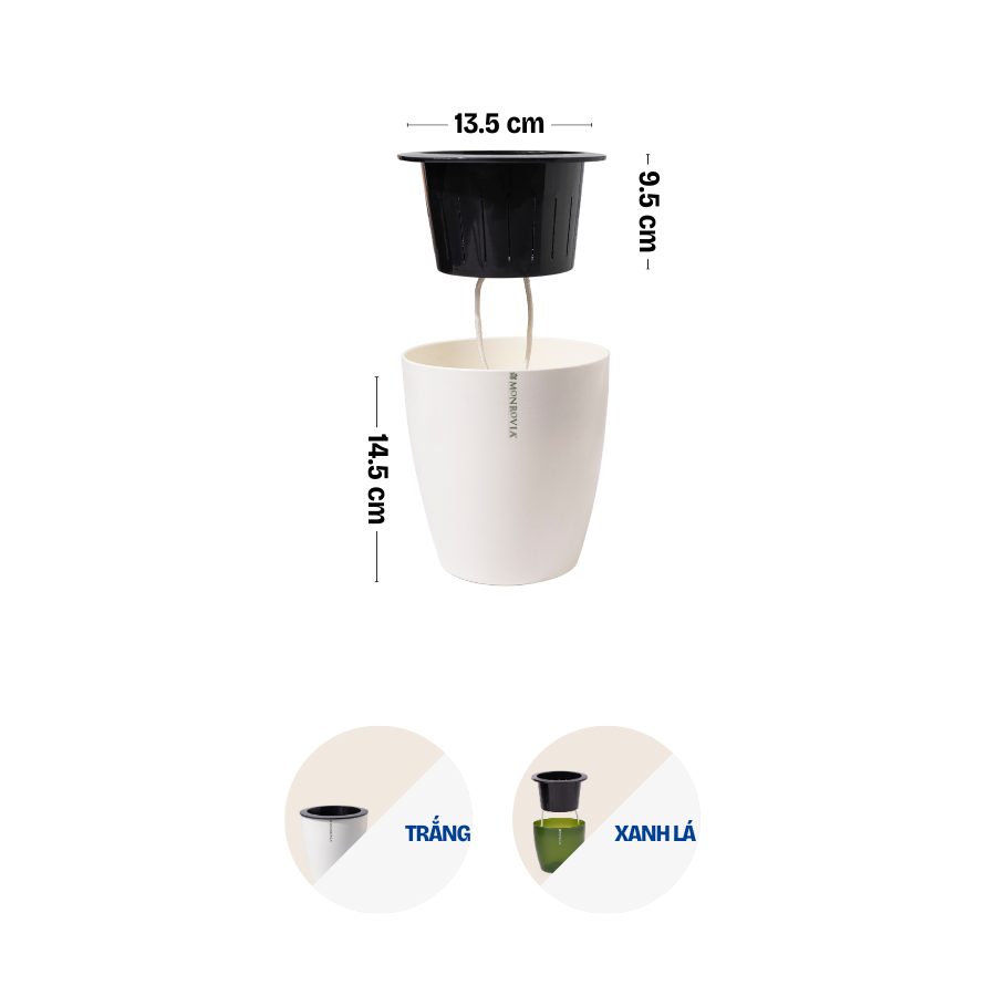DOCNEEM XIN GIỚI THIỆU ĐẾN BẠN MÃ SẢN PHẨM - CHẬU TRỒNG CÂY TỰ TƯỚI THÔNG MINH MONROVIA H0 Chất liệu: PP cao cấp Cấu tạo: Chậu bao gồm hai lớp chậu