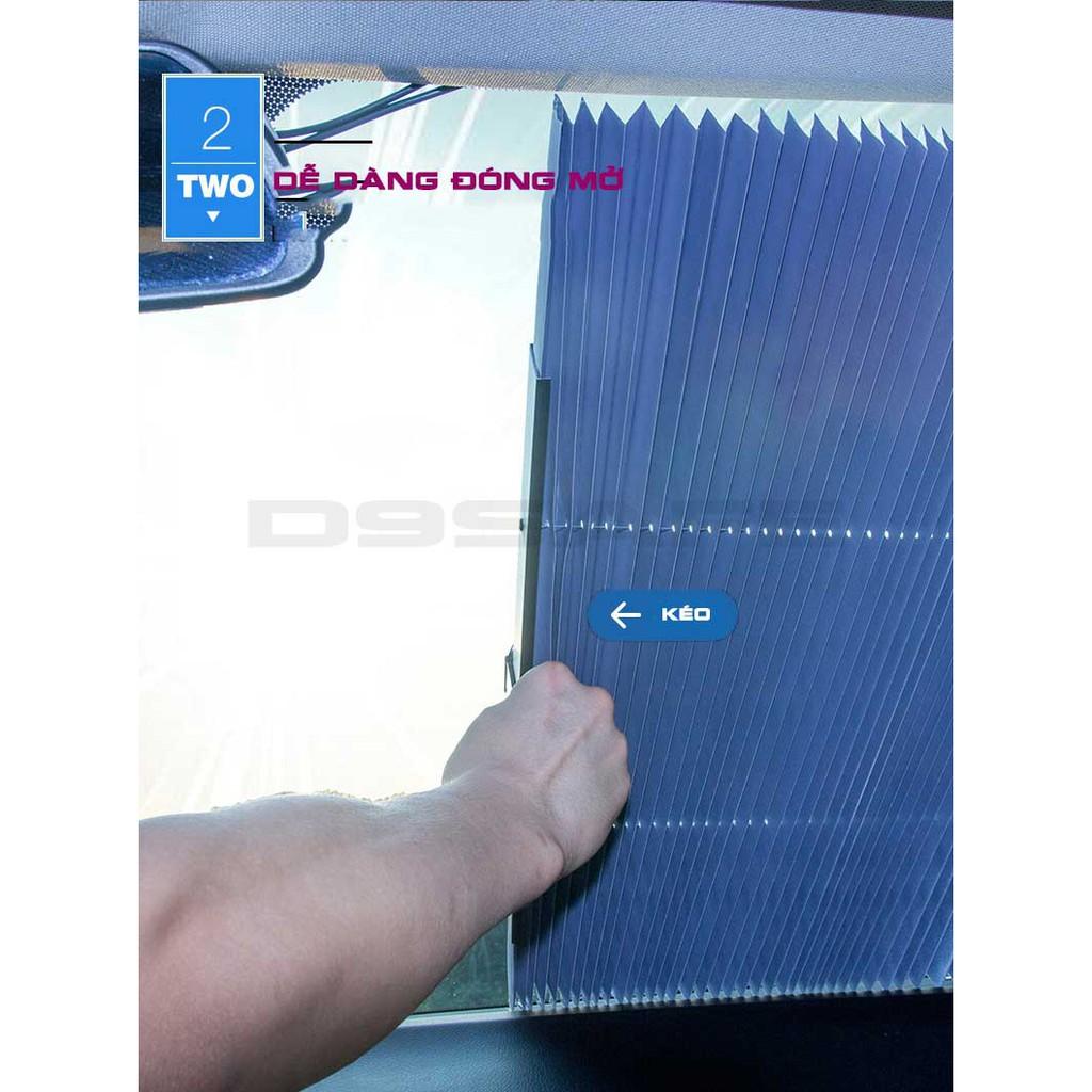 Rèm che nắng kính lái ô tô loại kéo, để bên trong kính ô tô Chất liệu rèm: Giấy nhôm cách nhiệt và Polime chống nóng. Khung được làm từ hợp kim nhôm cao cấp