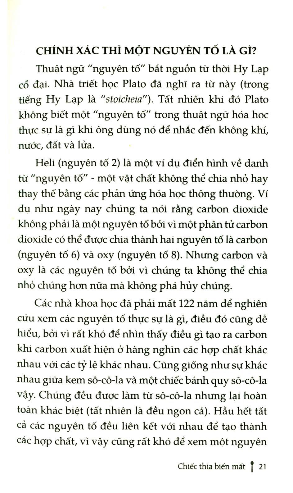Trong CHIẾC THÌA BIẾN MẤT, những kiến thức hóa học tưởng chừng khó nhằn và cứng nhắc đã được diễn giải một cách mềm mại, gần gũi và thực sự đời thường qua những câu chuyện về lịch sử, các truyền thuyết bí ẩn và cuộc đời của những nhà khoa học. Rồi bạn sẽ nhận ra tất cả những thứ xung quanh mình, kể cả những giá trị tinh thần như cảm giác hạnh phúc, bất hạnh và đôi khi là chính mạng sống của bạn cũng được quyết định bởi chúng - những nguyên tố hóa học .