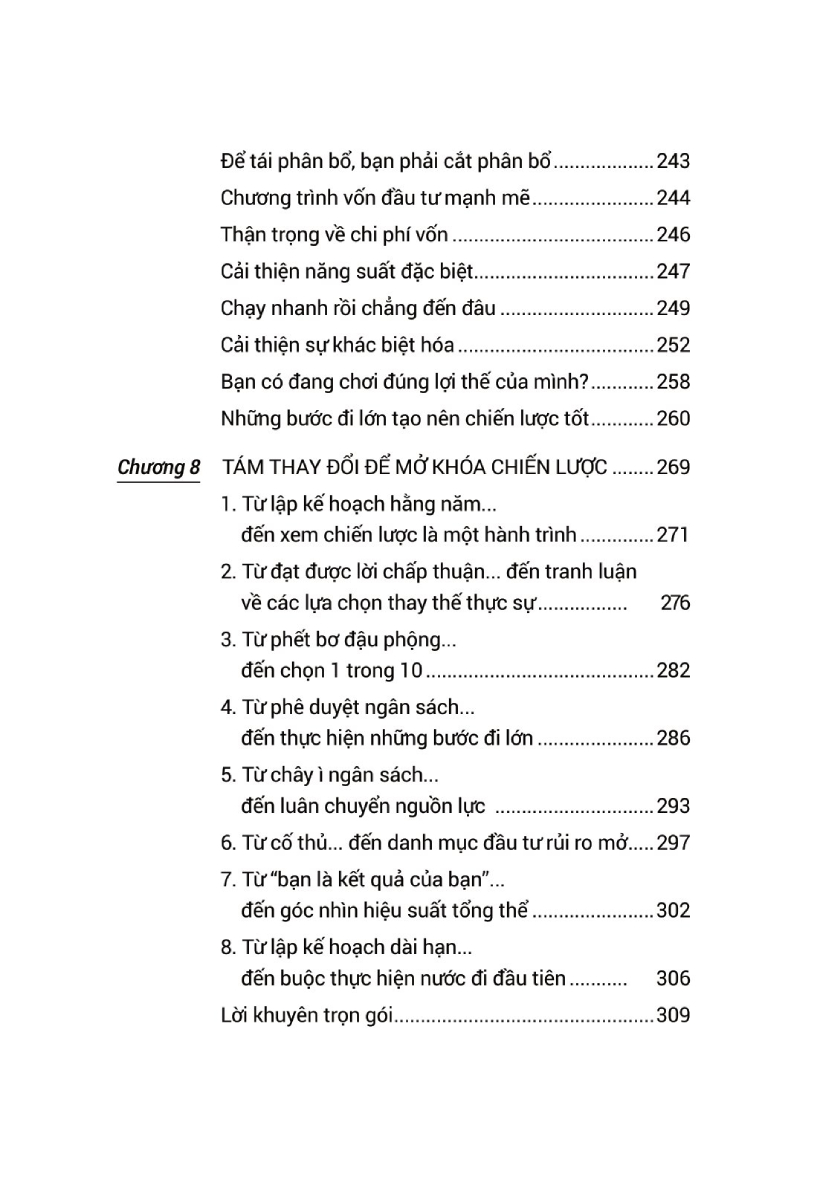Chiến lược là một lựa chọn khó thay đổi. Khi lựa chọn sai lầm, có trời mới cứu được bạn. Vì thế, khoan hãy quan tâm đến kế hoạch chi tiết, mà hãy tập trung vào sự lựa chọn. Chúng ta có những lựa chọn nào tốt hơn để không phải hối hận về sau? Theo các tác giả trong cuốn sách, bạn không nên trải đều nguồn lực cho mọi ý tưởng mà chỉ nên chọn 1 trong 10 – tập trung vào một ý tưởng tốt và cung cấp cho nó đủ nguồn lực để có thể đem lại trái ngọt cho bạn trong tương lai.
