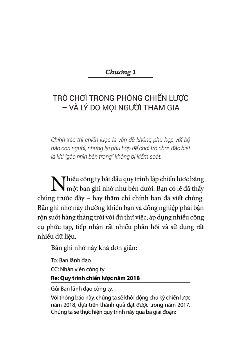 Cuốn sách Strategy Beyond the Hockey Stick: People, Probabilities, and Big Moves to Beat the Odds này có rất nhiều lời khuyên về cách lập chiến lược. Chẳng hạn, chiến lược không nên là kết quả của một cuộc họp hay một quy trình định kỳ hằng năm, mà nó nên là một hành trình liên tục, được theo dõi và điều chỉnh thường xuyên. Hoặc, chiến lược cũng không nên là một bản kế hoạch duy nhất mà mọi người cần đồng thuận ngay lập tức để kết thúc cuộc họp sớm, ngược lại, chúng ta cần có các ý kiến và câu hỏi khơi mào cho những lựa chọn khác.