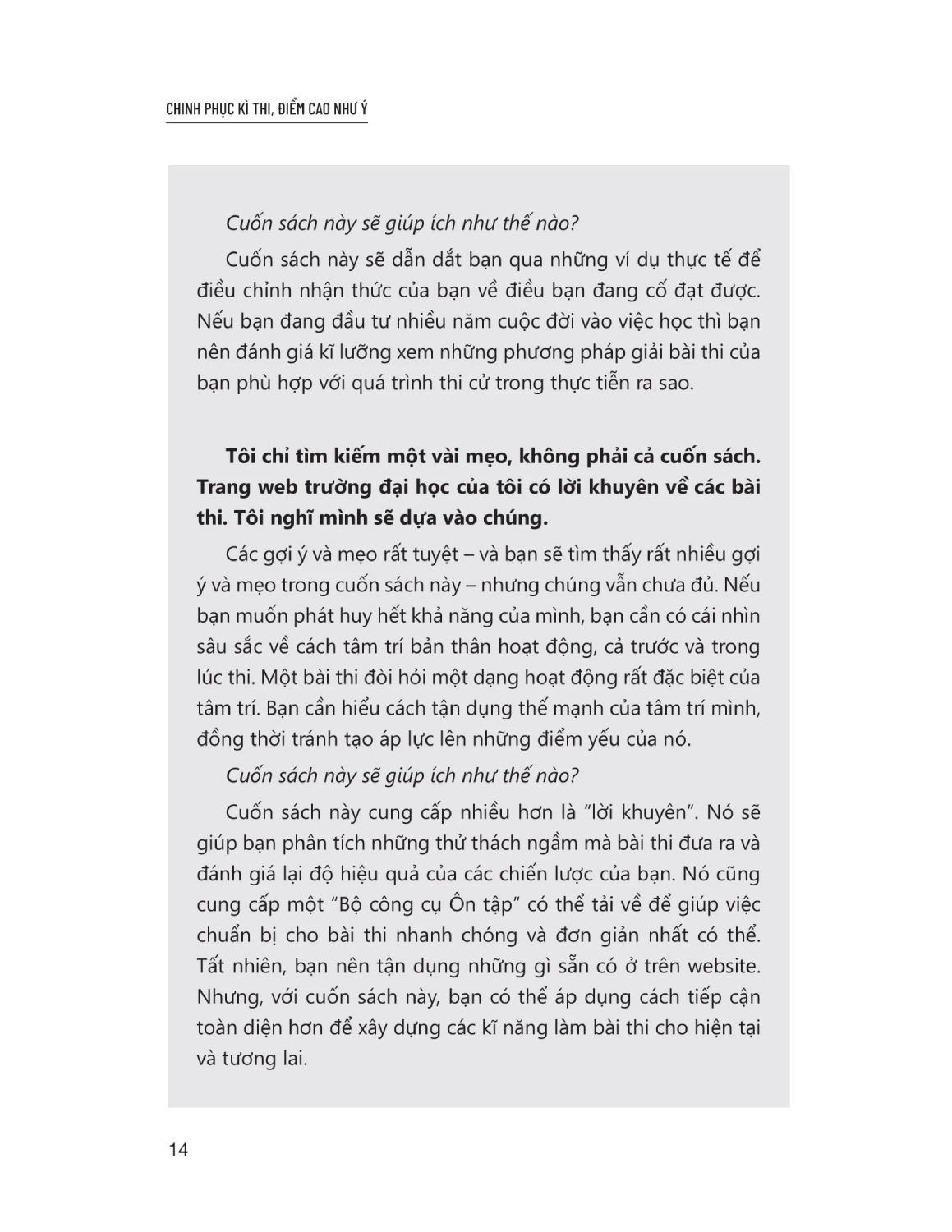 Hình thành hiểu biết sâu sắc về các bài thi và cách chuẩn bị cho chúng để bạn có thể tiếp cận chúng một cách tự tin và thành công ở hiện tại cũng như tương lai. Bên cạnh đó, cuốn sách sẽ giúp các bạn sinh viên xây dựng hiểu biết về các dạng bài thi thường gặp tại đại học, đồng thời hướng dẫn sinh viên lên chiến lược, lập kế hoạch ôn tập và tham dự kì thi sao cho đạt kết quả tốt nhất. Không chỉ vậy, sinh viên cũng sẽ học được cách vượt qua căng thẳng thi cử và ổn định về tâm lí để chinh phục kì thi. Đây chắc chắn là người bạn đồng hành không thể thiếu của sinh viên trong mọi bài thi tại giảng đường đại học.
