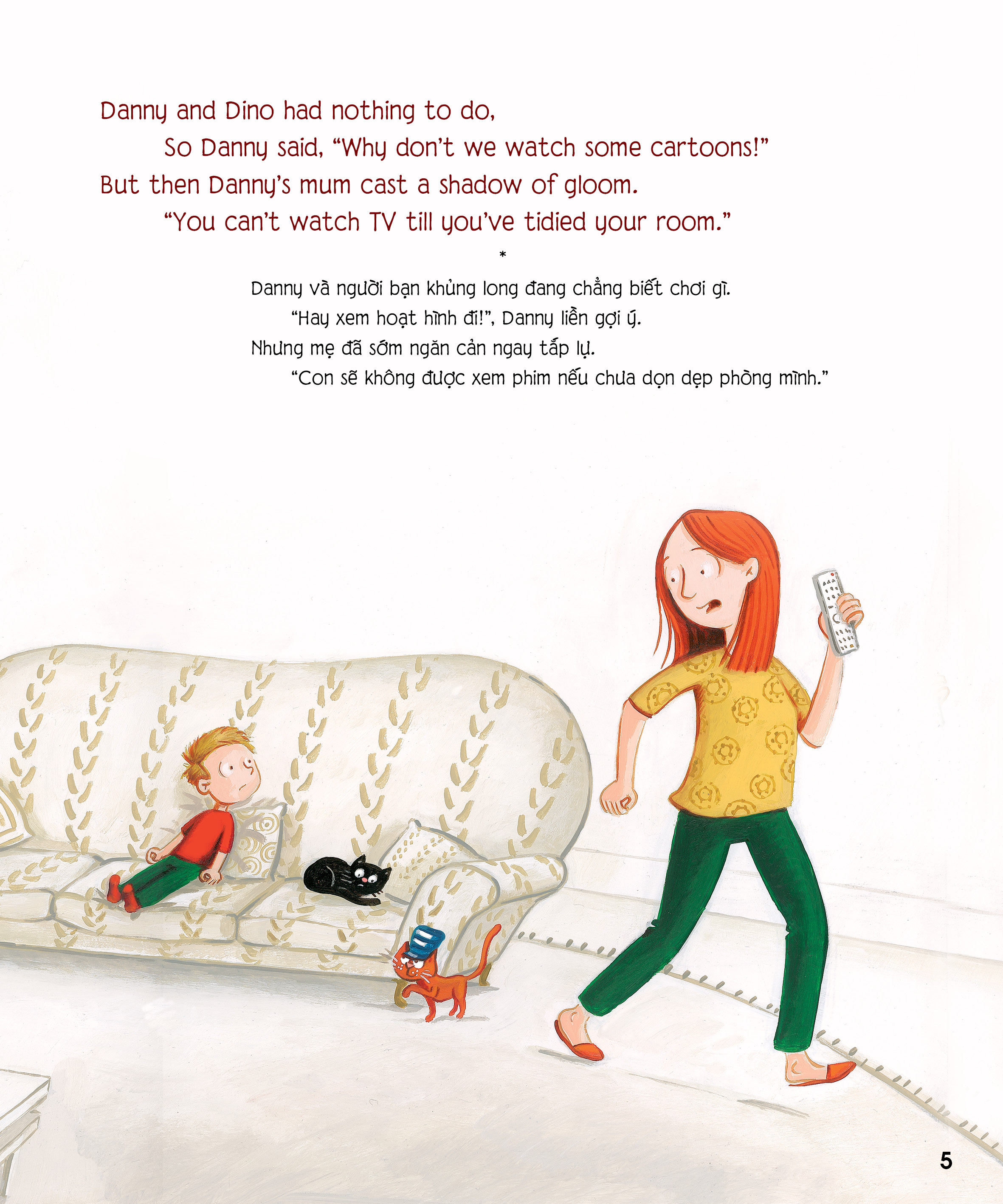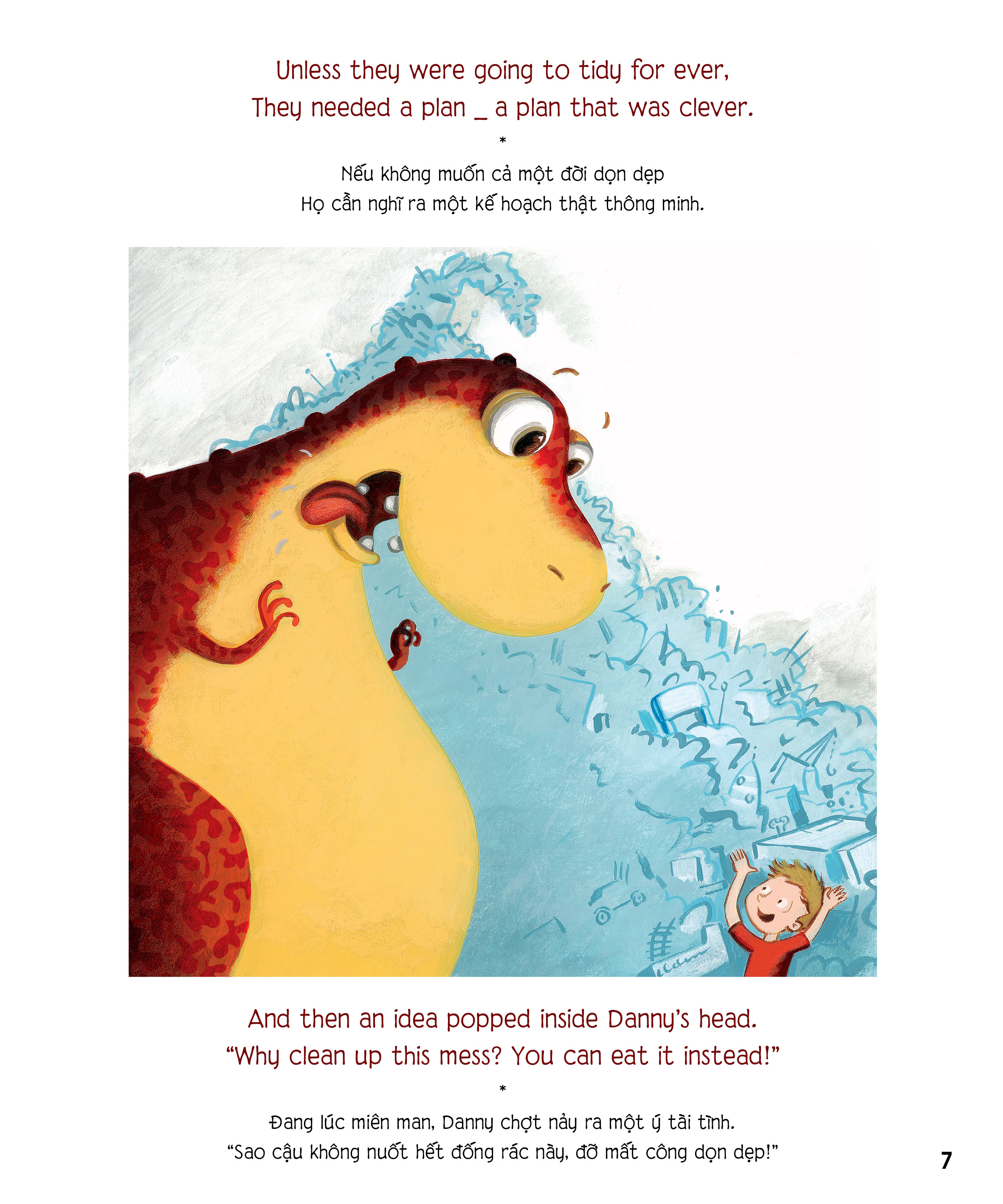 Chú khủng long tham ăn SONG NGỮ dành cho lứa tuổi mẫu giáo và tiểu học (2-8 TUỔI) là thế giới đầy sắc màu của đôi bạn thân Danny và chú khủng long Dino dễ thương nhưng háu ăn. Hễ đói, chú ăn tất tật mọi thứ trong tầm mắt, từ chiếc giường, nàng công chúa, bố, mẹ, bà, ngôi nhà đang ở, cầu vồng và thậm chícả một hành tinh khổng lồ. Nhưng ăn xong, cậu đều hối hận vô cùng và đều rút ra được bài học cho bản thân. Cuối cùng, để sửa chữa sai lầm, cậu quyết định ị ra trả lại mọi thứ nguyên vẹn.