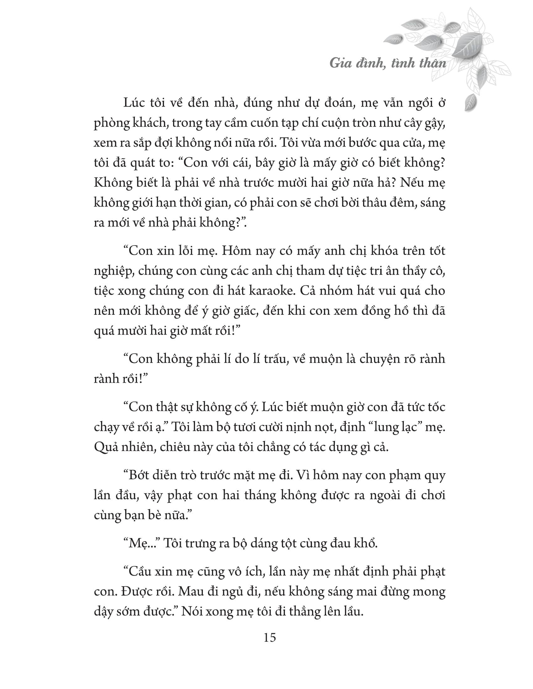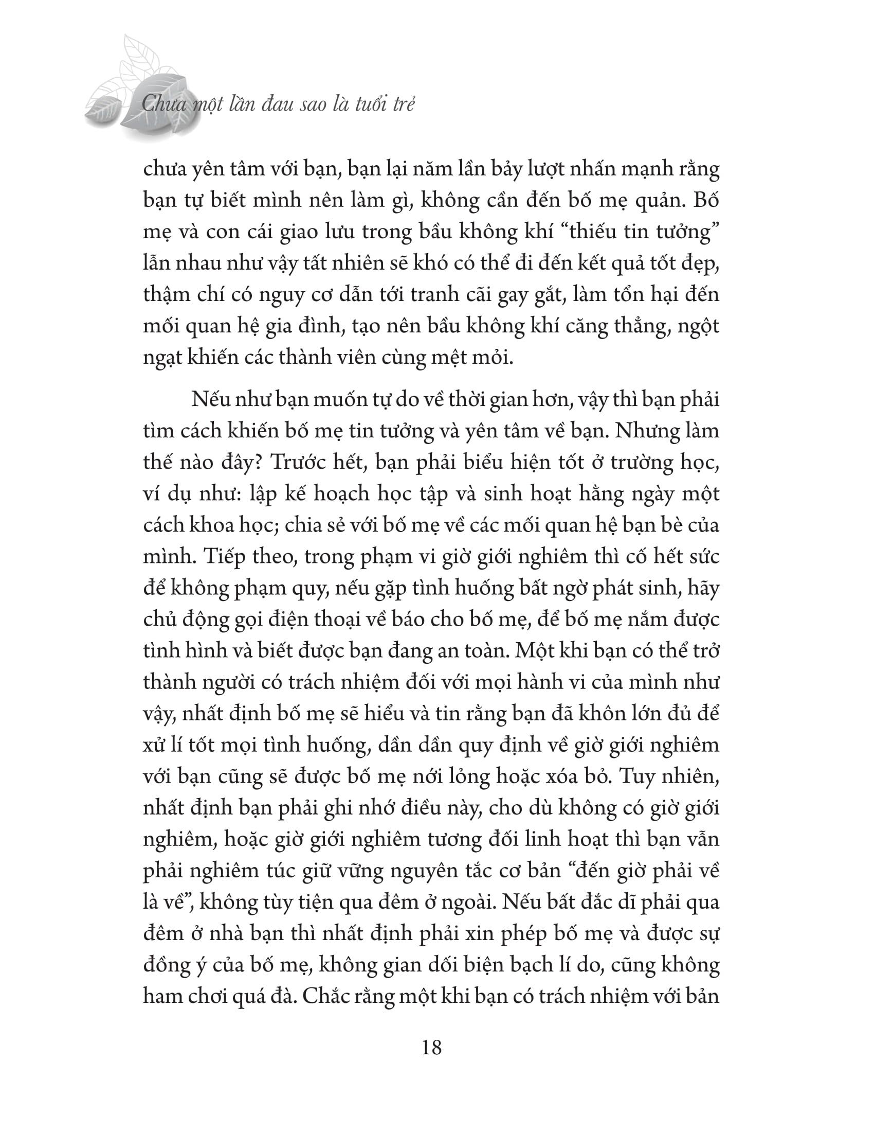 Nếu có thể làm cho bản thân mình trở nên kiên cường và hiểu biết hơn thì những vấp ngã kia có sá gì? Chỉ cần bên cạnh bạn có những đôi tay sẵn sàng chìa ra nâng đỡ, có những bờ vai cho bạn tựa vào, có những cái ôm động viên khích lệ, vậy thì quá trình trưởng thành của bạn vĩnh viễn không hoài phí, mà còn nhận được nhiều hơn. Cuốn sách này gồm 45 câu chuyện về những nỗi ưu phiền thời thanh xuân của bất kì ai trong chúng ta, hãy mang theo nó và lòng can đảm tiến về phía trước để có những trải nghiệm, cảm nhận và tìm ra lời giải cho những nỗi đau đớn mà bạn đang ôm giữ trong lòng…