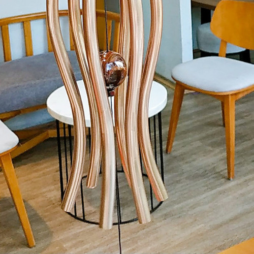 - Chuông gió được làm thủ công bằng các ống tre trúc, dưới bàn tay của nghệ nhân nó được biến tấu với các âm điệu khác nhau. - Một bộ chuông gió gồm 6