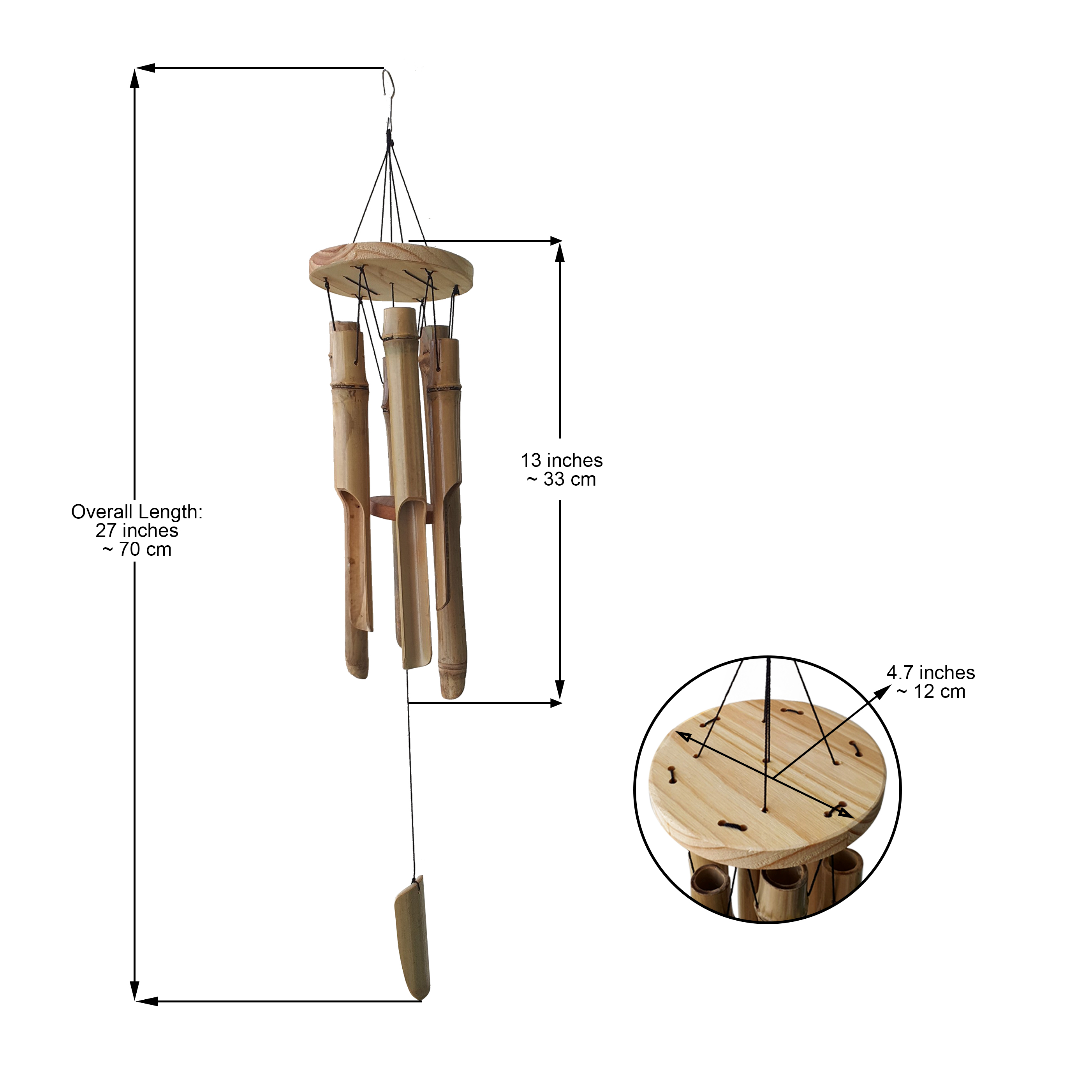 Một bộ chuông gió gồm 6 ống trúc, chóp là đĩa gỗ hình tròn. Âm thanh vang nhẹ nhàng của chuông gió tre trúc giúp chúng ta thư giãn, nạp lại năng lượng sau ngày dài làm việc.
