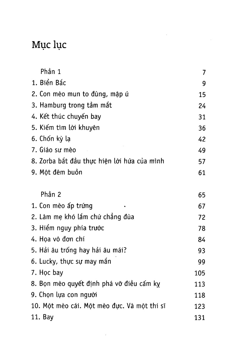 Lời hứa của một con mèo cũng là trách nhiệm của toàn bộ mèo trên bến cảng, bởi vậy bè bạn của Zorba bao gồm ngài mèo Đại Tá đầy uy tín, mèo Secretario nhanh nhảu, mèo Einstein uyên bác, mèo Bốn Biển đầy kinh nghiệm đã chung sức giúp nó hoàn thành trách nhiệm. Tuy nhiên, việc chăm sóc, dạy dỗ một con hải âu đâu phải chuyện đùa, sẽ có hàng trăm rắc rối nảy sinh và cần có những kế hoạch đầy linh hoạt được bàn bạc kỹ càng…