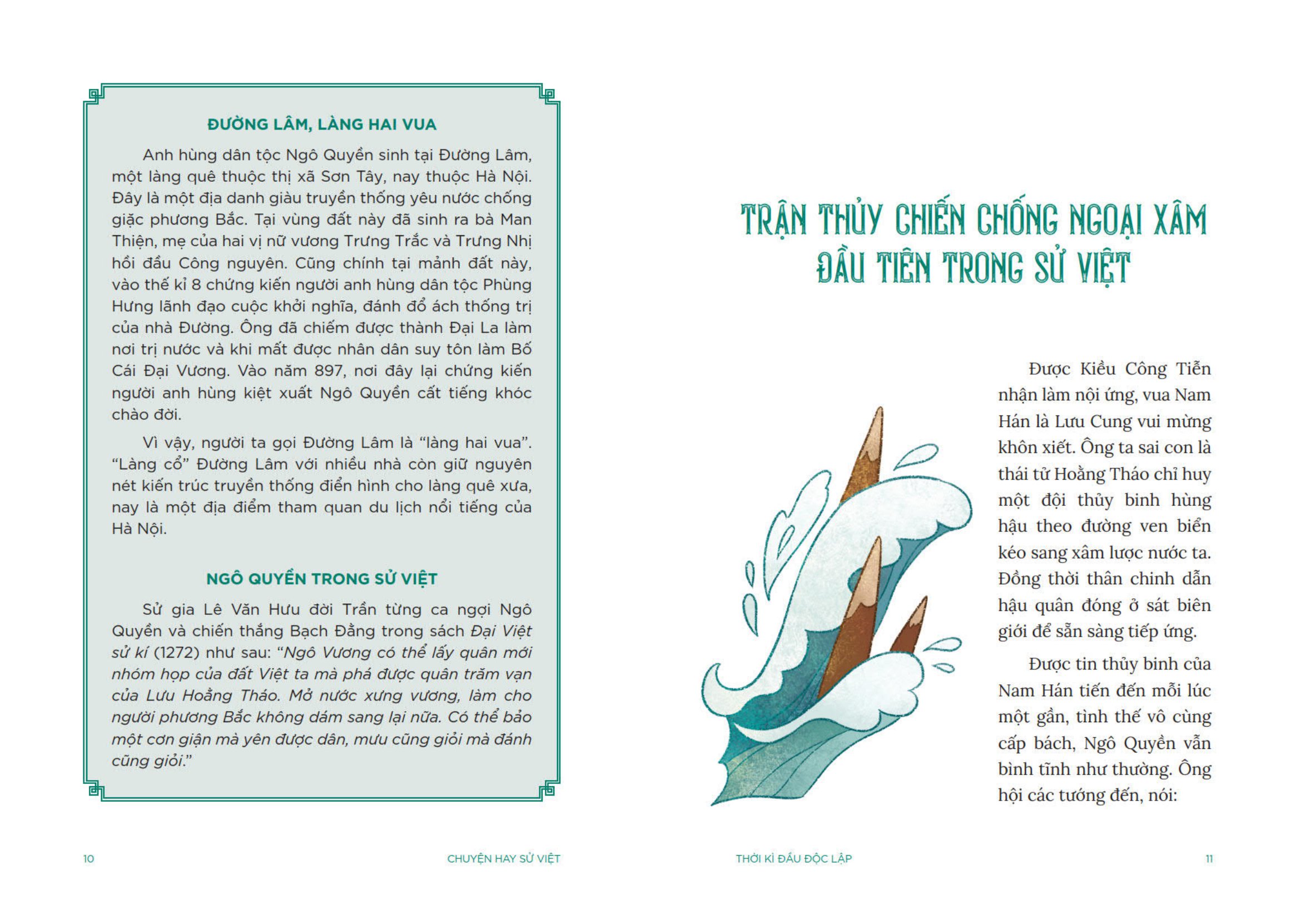 Mã hàng 8935244897302 Độ Tuổi 6 - 15+ Tên Nhà Cung Cấp Nhà Xuất Bản Kim Đồng Tác giả Nguyễn Như Mai, Nguyễn Quốc Tín, Nguyễn Huy Thắng NXB Kim Đồng Năm XB 2024 Ngôn Ngữ Tiếng Việt Trọng lượng (gr) 175 Kích Thước Bao Bì 20.5 x 14.5 x 0.6 cm Số trang 132 Hình thức Bìa Mềm Chuyện Hay Sử Việt - Thời Kì Đầu Độc Lập - Khai Mở Nền Tự Chủ Lịch sử đất nước đã trải qua hàng nghìn năm với biết bao thời khắc huy hoàng và bi tráng. Bộ sách Chuyện Hay Sử Việt sẽ dẫn dắt bạn đọc đi ngược dòng thời gian, thông qua những sự kiện hào hùng, câu chuyện về những nhân vật được ghi trong chính sử và cả các huyền tích, giai thoại lưu truyền trong dân gian. Thời Kì Đầu Độc Lập – Khai Mở Nền Tự Chủ làcuộcgặp với các gương mặt danh nhân: Ngô Quyền, Đinh Bộ Lĩnh, Lê Hoàn… Những triều đại phong kiến sơ khai do họ dựng lên có vai trò khai mở cho nền độc lập tự chủ của Việt Nam. Cùng với những minh họa sống động, gần gũi, đời sống của người xưa, bộ sách Chuyện Hay Sử Việt làm sống dậy những suy nghĩ và tình cảm, mưu cầu và khát khao của họ trên từng trang sách, giúp các bạn trẻ hiểu rõ hơn về chặng đường quá khứ mà ông cha ta đã đi qua và góp phần tăng thêm lòng tự hào dân tộc, thêm yêu lịch sử nước nhà và có ý thức hơn về trách nhiệm đối với đất nước.