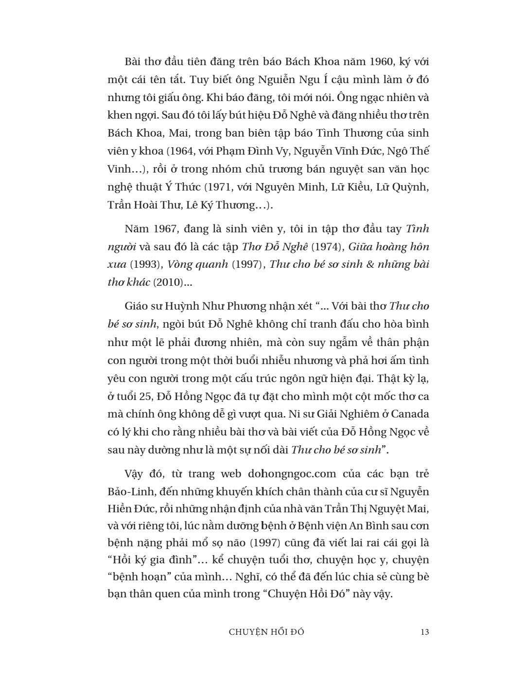 Tác giả - Bác sĩ Đỗ Hồng Ngọc một lần nữa gửi đến độc giả Phanbook tác phẩm đậm chất mộc mạc và sâu lắng. Không phải hồi ký, "Chuyện hồi đó" là tuyển tập những câu chuyện xưa, cũ nhưng cũng đầy kỷ niệm gắn liền với con đường sự nghiệp bác sĩ, văn sĩ, thi sĩ của tác giả. Qua những trang sách "Chuyện hồi đó", độc giả có thể tìm thấy những hình ảnh và câu chuyện từ thuở thiếu thời của tác giả, hay lần theo những cột mốc đã đưa tác giả bén duyên với văn học, y học, Phật học và thiền định. Cuốn sách tập hợp tất cả những câu chuyện mà tác giả Đỗ Hồng Ngọc muốn ôn lại kỷ niệm cùng độc giả - những người đã đồng hành từ trang sách đến những bài blog cá nhân. Và hơn hết, cuốn sách cũng là món quà mà tác giả muốn dành tặng cho chính mình.