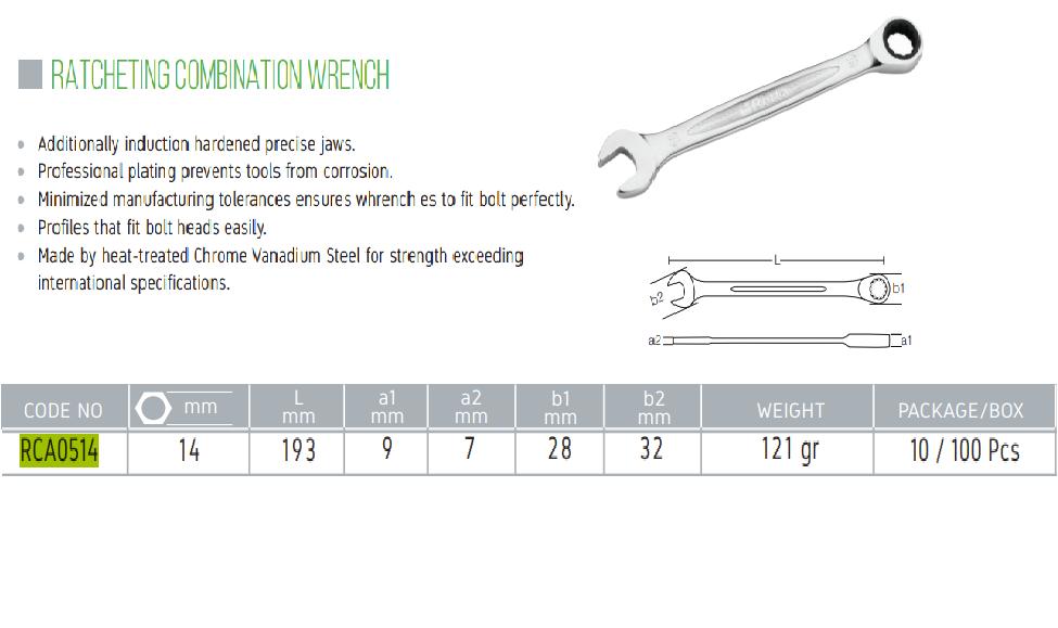 Cờ lê đa năng tự động 14mm- Retta - RCA0514 Model: RCA0514 Cờ lê đa năng Retta RCA0514 14mm là sản phẩm của thương hiệu Retta nhỏ gọn, tiện lợi khi sử dụng và chức năng chính là giữ và xoay đai ốc, bulong, chốt và các bộ phận có ren. Cờ lê đa năng Retta RCA0514 được làm từ thép CR-V với lớp mạ chrome bóng, giúp ngăn ngừa ăn mòn, gỉ sét và biến dạng, không bị cong hay gãy khi chịu lực mạnh. Thiết kế chuyên nghiệp với 1 đầu mở, 1 đầu tròn