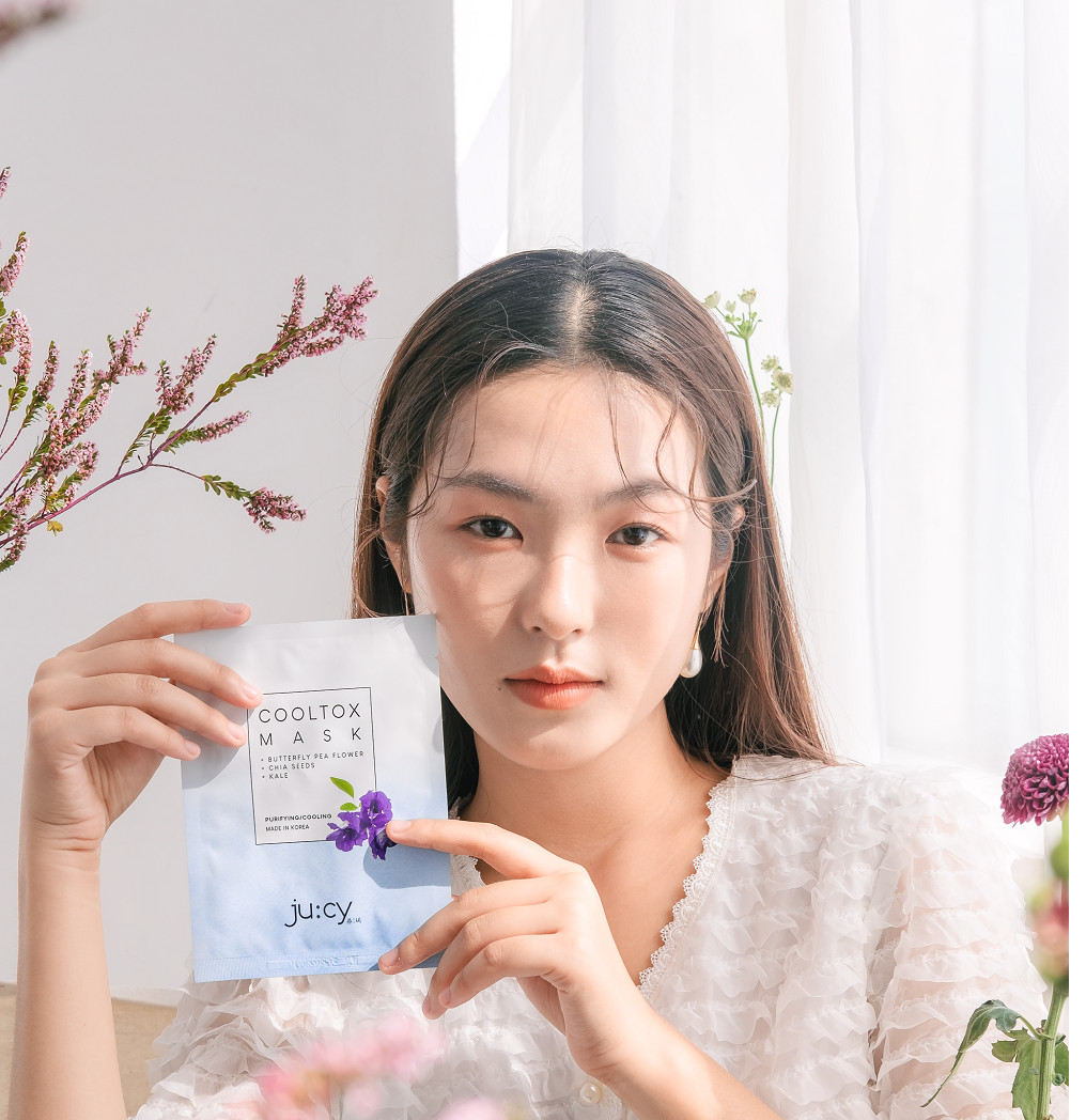 Mặt nạ Ju:cy Cooltox Mask xuất xứ từ Hàn Quốc, với chất liệu thuần chay (Vegan Certified Sheet) - được làm từ sợ thiên nhiên rất tốt cho da nhạy cảm, khả năng thấm hút gấp 1,5 lần so với cotton giúp tăng cường độ ẩm cho da.
