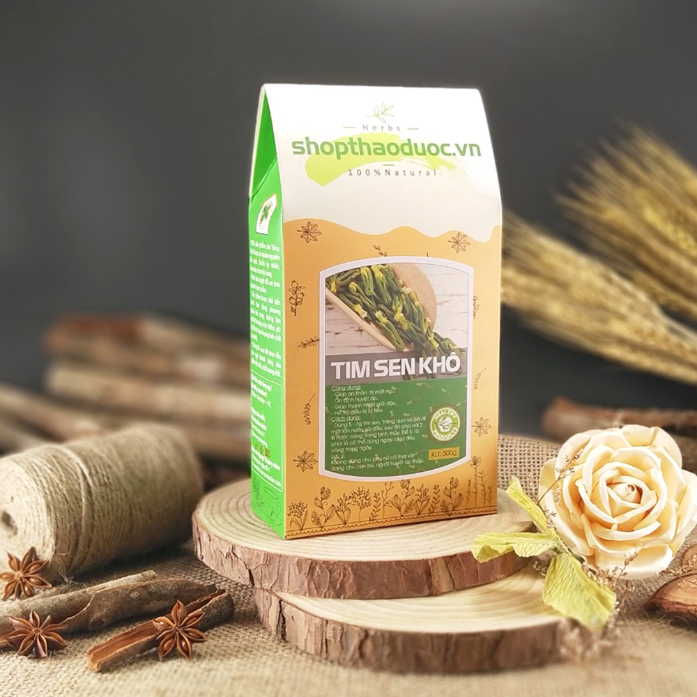 I. GIỚI THIỆU TIM SEN: Sen có tên tiếng anh là (Nelumbo nucifera) hay còn được gọi là sen hồng, là một loài thực vật thuỷ sinh thân thảo sống lâu năm thuộc chi sen.Trong thời kỳ cổ đại nó đã từng là loại cây mọc phổ biến dọc theo bờ sông Nin ở Ai Cập . Thân rễ sen mọc trong các lớp bùn trong ao và sông hồ cong các lá thì nổi ngay trên mặt nước. Các thân già có nhiều gai nhỏ. Hoa thường mọc trên các thân to và nhô cao vài cm phía trên mặt nước. Thông thường sen có thể cao tới 1,5m và có thể phát triển các thân rễ bò theo chiều ngang tới 3m, một vài nguồn chưa kiểm chứng được cho biết nó có thể cao tới trên 5m. Lá to với đường kính 60 cm, trong khi các bông hoa to nhất có thể có đường kính 20 cm. Có nhiều giống sen được trồng với màu hoa trắng như tuyết tới màu vàng hay hồng nhạt. Loài cây này có thể trồng bằng hạt hay thân rễ. Hoa sen là biểu tượng của sự thanh cao, xuất hiện trong nhiều văn thơ mạng ý nghĩa tâm linh, hạt sen là món ngon bổ dưỡng lưu truyền từ xưa đến nay, đặc biệt theo kinh nghiệm dân gian, khi mất ngủ ngoài việc dùng thuốc an thần, người ta dùng tim sen rất hiệu quả. Trà tim sen chúng tôi được bóc tách cẩn thận, nguyên tim không dập nát và được sấy khô nhiệt độ thấp trong thời gian dài, chính vì vậy nên giữ được màu xanh và mùi vị thơm tự nhiên của tim sen. II. CÔNG DỤNG CỦA TIM SEN KHÔ: