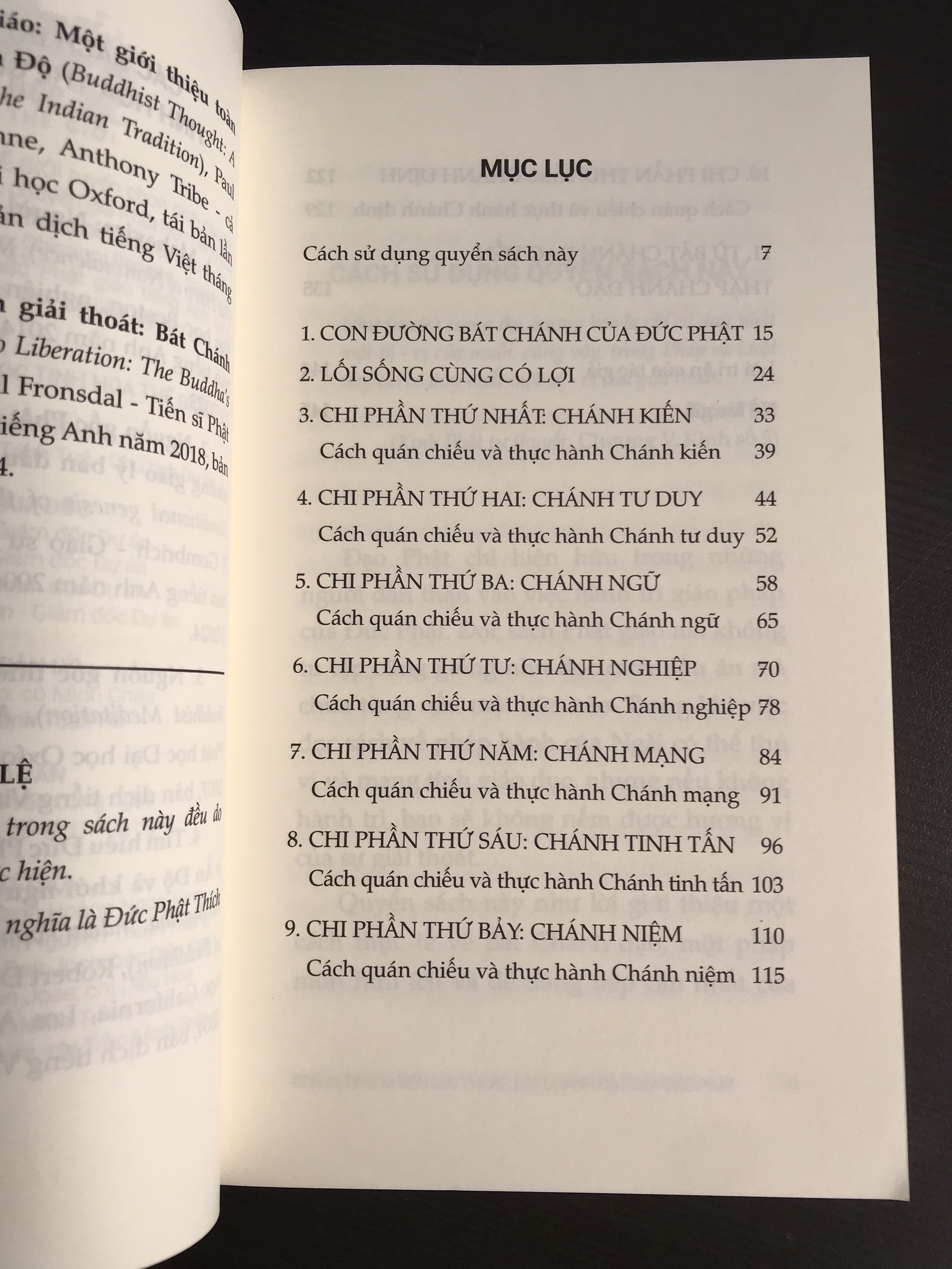- Bát Chánh Đạo - Con Đường Đi Đến Giải Thoát Của Đức Phật Tác giả: Gil Fronsdal Dịch giả: Thích Quảng Thuận Hiệu đính: Nguyễn Hiếu Thuần Minh Ngôn ngữ: Tiếng Việt Năm xuất bản: 2024 Số trang: 147 Nhà phát hành: LP Books Nhà xuất bản: Tri Thức Kích thước: 13 x 20.5 cm Hình thức: bìa mềm Quyển sách này như lời giới thiệu một cách thực tế về Bát Chánh đạo, một pháp môn hữu ích và dễ dàng tiếp cận nhất của Đức Thế Tôn để giúp hành giả bước trên đạo lộ giải thoát. Quyển sách gồm những quán chiếu và rèn luyện cho từng chi phần để hỗ trợ cho sự tu tập của cá nhân với mỗi chi trong tám chi phần. Dành thời gian để thực tập những quán chiếu và rèn luyện này là cách làm sâu sắc thêm mối gắn kết giữa bạn với Bát Chánh đạo và cũng là cách để vận dụng chúng vào cuộc sống một cách thuần thục hơn. Bát Chánh Đạo là sự trợ duyên rất lớn cho việc hành thiền. việc tu tập các chi phần của Bát Chánh đạo trong đời sống hằng ngày sẽ tạo ra một tâm tương trợ cho việc hành thiền. 2. Tứ Diệu Đế (Đạo Lộ - Đường Đến Chân Hạnh Phúc) Tác giả: Lama Thamthog Rinpoche Dịch giả: Hồ Thị Thu Hiền (Tenzin Pema) Khổ sách: 14.5x20.5cm Loại bìa: bìa mềm Số trang: 212 Thông điệp của tôn sư Lama Thamthog Ripoche trong cuốn sách “Đạo Lộ - Đường đến chân hạnh phúc” sẽ dẫn dắt hành giả từng bước ứng dụng những lời dạy của Đức Phật vào đời sống hằng ngày với lòng từ bi, vị tha. Vượt qua mọi cảm xúc phiền não để sống cuộc đời an bình với một trái tim nhân hậu là cách cuốn sách “Đạo Lộ - Đường đến chân hạnh phúc” muốn chúng ta hướng đến. Cuốn sách này là tập hợp các bài giảng trực tuyến của tôn sư Lama Thamthog Rinpoche về Tứ Diệu Đế; Cái chết, Thân trung gian và Tái sinh; Mười hai mắt xích nhân duyên. Trong các bài giảng này, thầy đã giải thích đầy đủ và dễ hiểu những điểm cốt lõi, giúp chúng ta có được hiểu biết cơ bản về Tứ Diệu Đế - nền tảng trong mọi giáo pháp của Đức Phật. Theo ngài Thamthog Ripoche: “Để loại bỏ khổ đau và đạt được hạnh phúc tuyệt đối, chúng ta cần loại bỏ nguyên nhân, hạt giống, dấu ấn thói quen (tập khí) của khổ”. Đọc cuốn sách này, bạn đọc sẽ lĩnh hội những lời giảng một cách trực tiếp và sâu sắc của tôn sư. Qua đó, độc giả sẽ thấm sâu hơn giáo lý Tứ diệu đế, hiểu được nguyên nhân của khổ đau bắt nguồn từ vô minh, từ vô minh dẫn đến vô số khổ đau là quả.