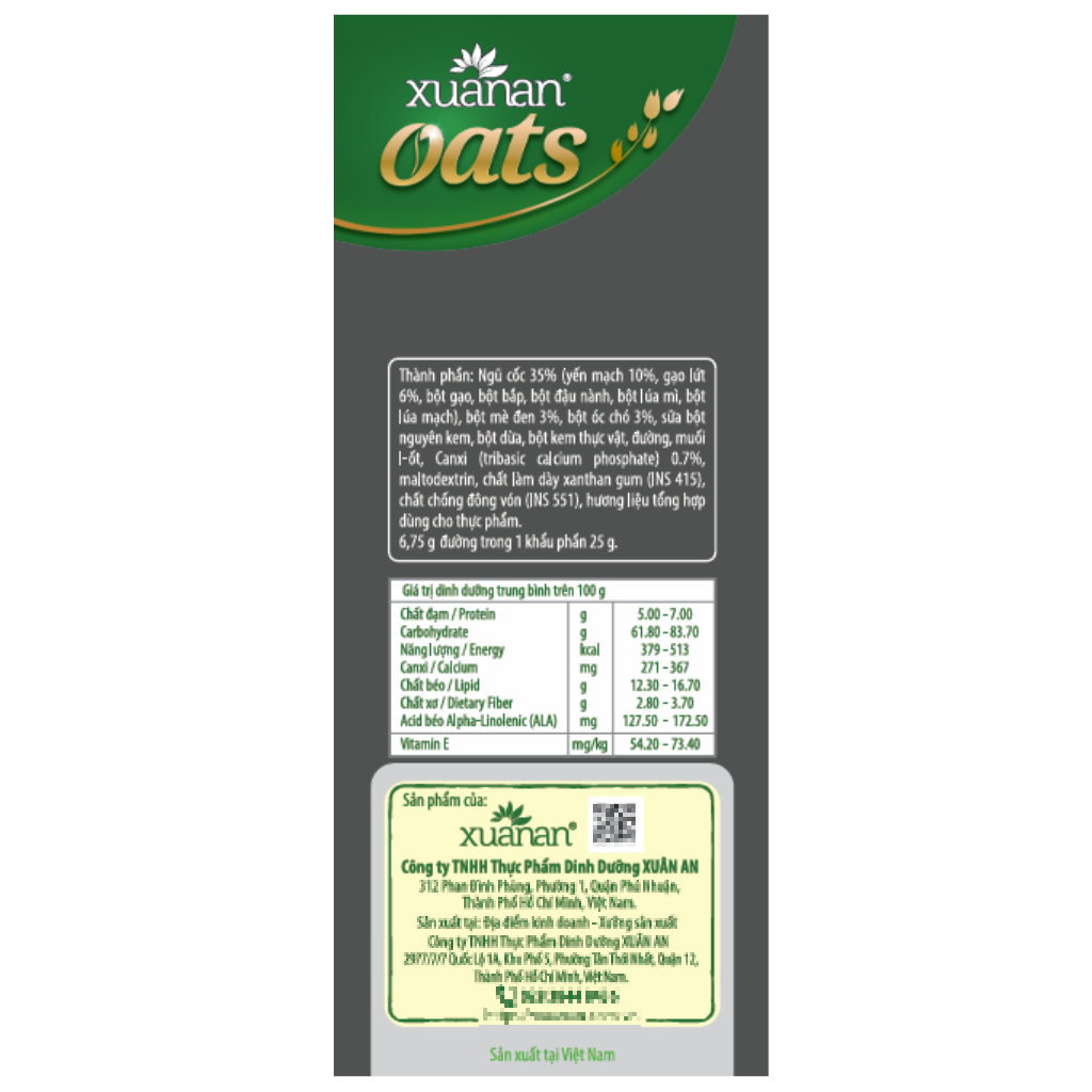 Thành phần: Ngũ cốc 32% (gạo lứt huyet rong 10%, yến mạch 6%, gạo lứt, gạo nếp cẩm 3%, bắp, đậu nành, lúa mỳ, lúa mạch), bột kem thực vật 29%, đường, đường ăn kiêng Isomalt, sữa tách béo 7%(Instant Skim Milk Powder &%), bột dừa, Canxi 0.7%, Muối I-ốt, maltodextrin, chất maltodextrin làm dày xanthan gum (E415), chất chống đông vón (E551), hương liệu tổng hợp dùng cho thực phẩm. 6.5 g đường trong khẩu phần 25g