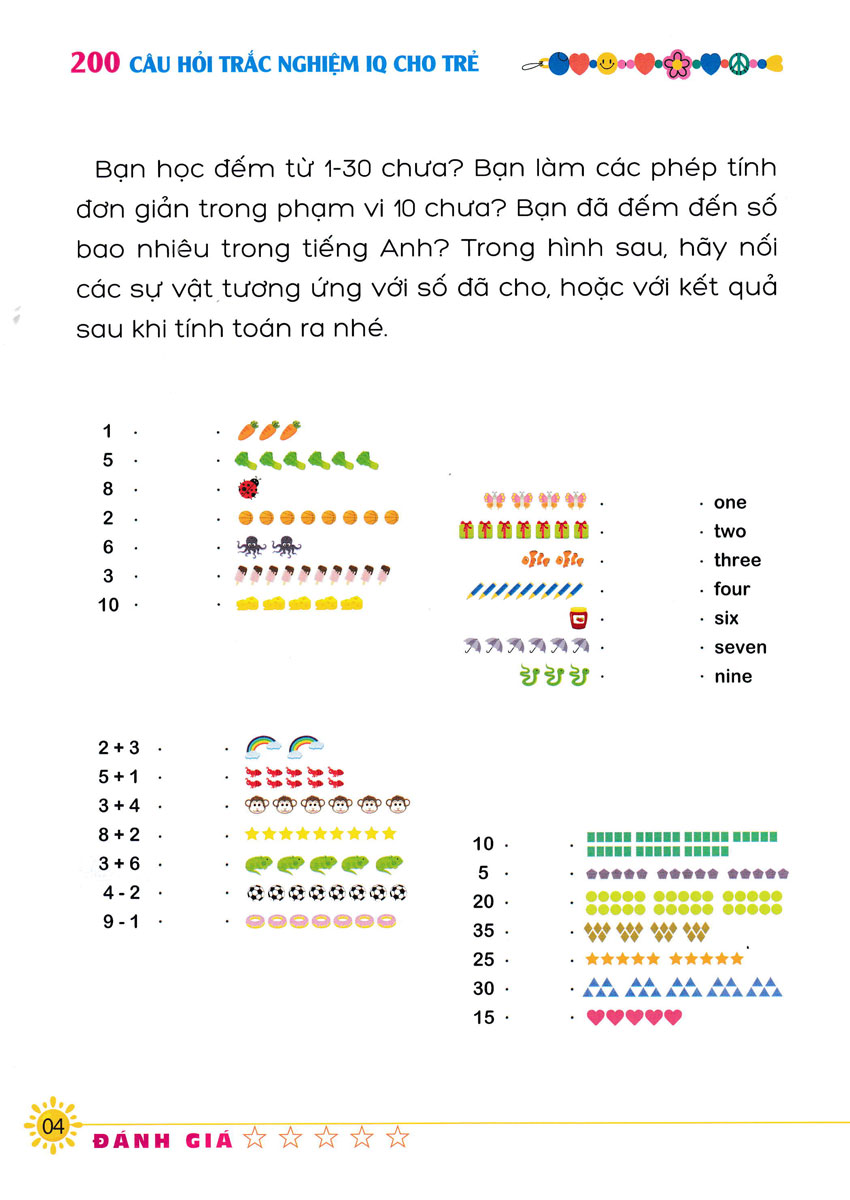 200 Câu hỏi IQ cho trẻ bao gồm những bài tập hữu ích cho việc cải thiện tư duy suy luận logic tăng cường khả năng giao tiếp phân tích thông tin của trẻ, bạn sẽ tìm thấy nhiều dạng bài tập vừa thú vị vừa đòi hỏi sự động não để hỗ trợ phát triển trí óc tư duy cho trẻ một cách hiệu quả.