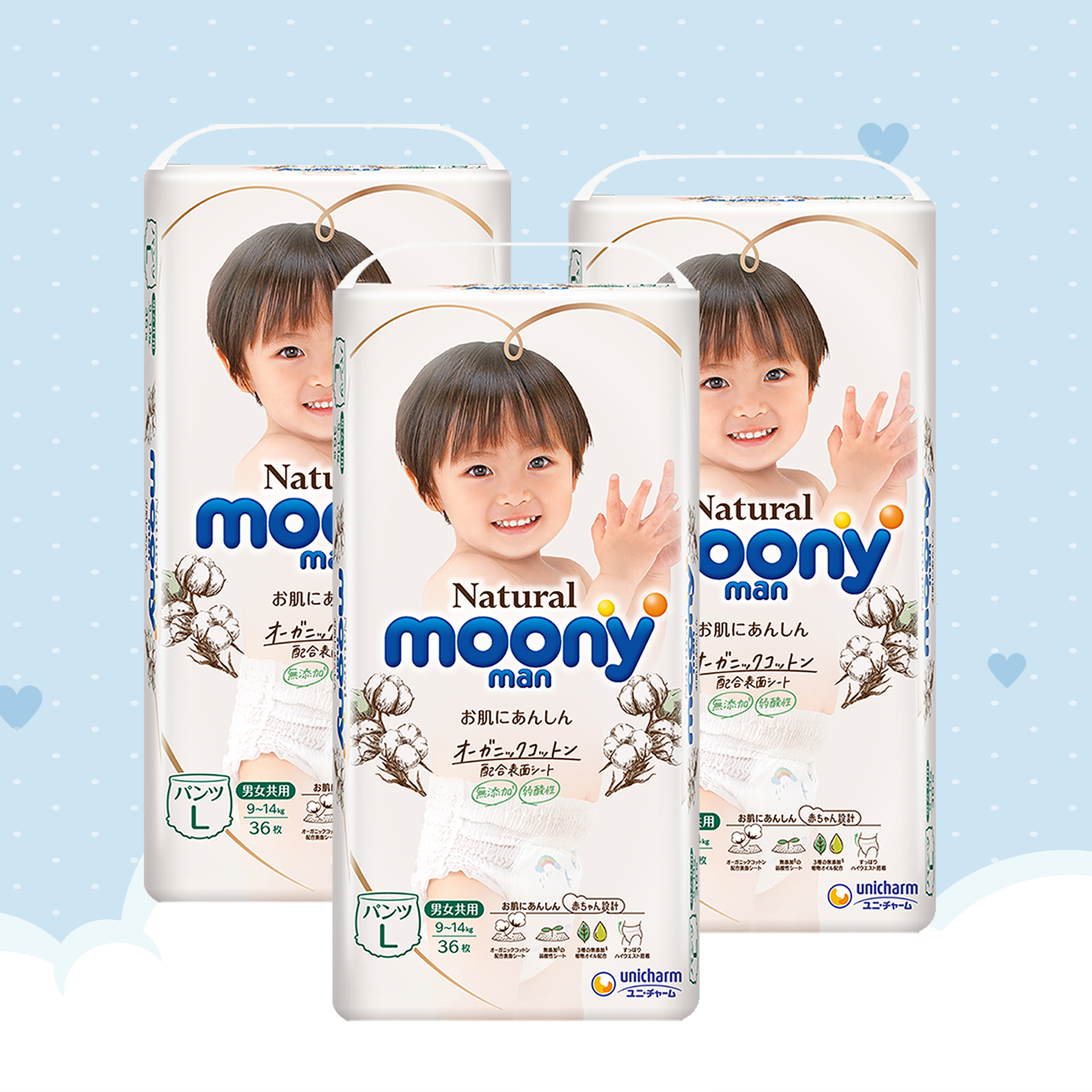 Giới thiệu Bỉm tã quần Moony Natural là dòng sản phẩm thương hiệu Moony đến từ tập đoàn Unicharm Nhật Bản. Tã siêu cao cấp Moony Natural với cải tiến vượt bậc, sử dụng bề mặt Bông hữu cơ đầu tiên tại Nhật Bản. Ưu điểm nổi bật ⮞Bề mặt Organic Cotton