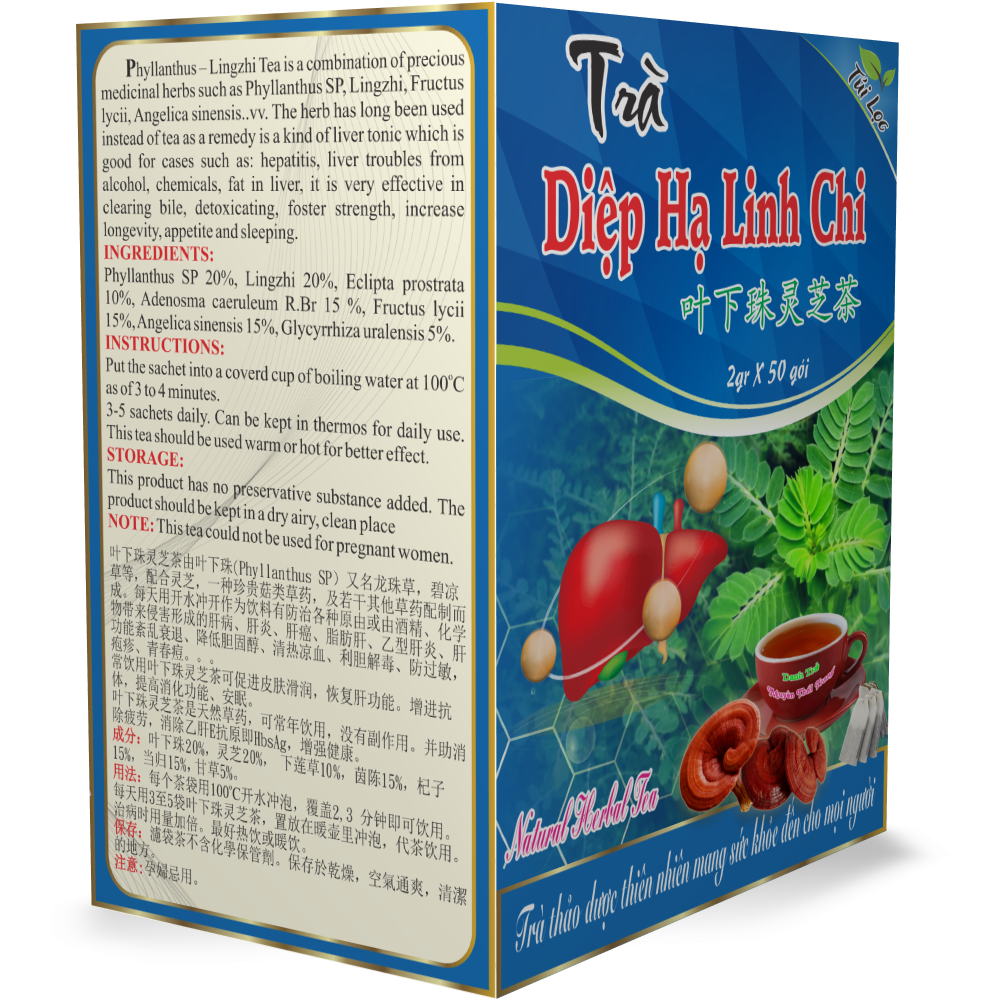 Trà được chế biến từ cây Diệp Hạ Châu “phyllanthus SP”, dân gian ta còn gọi là “CHÓ ĐẺ RĂNG CƯA” được kết hợp với nấm Linh Chi là một thảo dược quý rất tốt cho sức khỏe, cùng với các thảo dược thiên nhiên khác làm thành trà, thay nước uống hằng ngày hỗ trợ và rất tốt cho người bị viên gan, viên gan siêu vi B, viên gan mãn tính, viên gan cấp, rối loạn chức năng gan do rượu – hóa chất, hạ cholesterol – gan nhiễm mỡ, mỡ trong máu, thông mật giải độc, thanh nhiệt, chống dị ứng, mụn nhọt …vv.