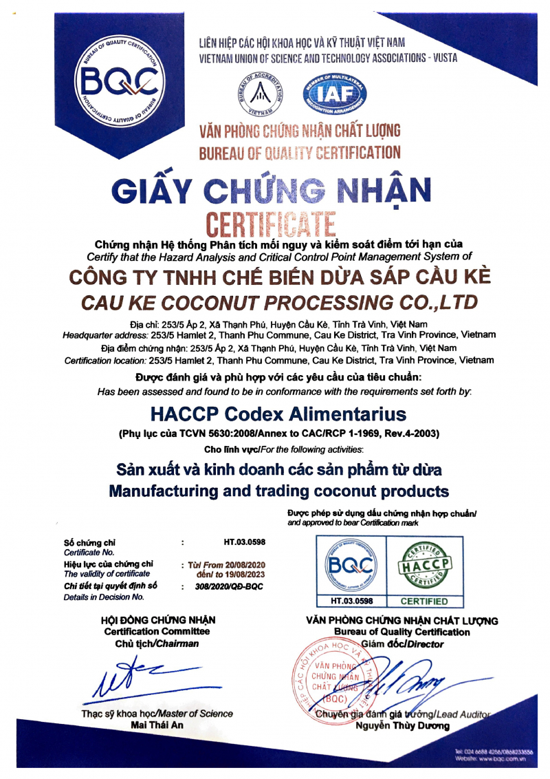 - Các thành tựu nổi bật đã được thực tế khẳng định: Quy trình sản xuất đạt chứng nhận ISO 22000:2018; ISO 9001:2015, HACCP, FDA và gần đây nhất là HALAL. Vicosap đang có mặt ở các Chuỗi Siêu thị lớn, Hệ thống Sân bay Quốc tế, các Cửa hàng Đặc sản, Điểm du lịch…. Sản phẩm dừa sáp Vicosap đã xuất khẩu chính ngạch thành công các thị trường khó tính như Nhật Bản, Anh, Mỹ, Hongkong và Đài Loan …