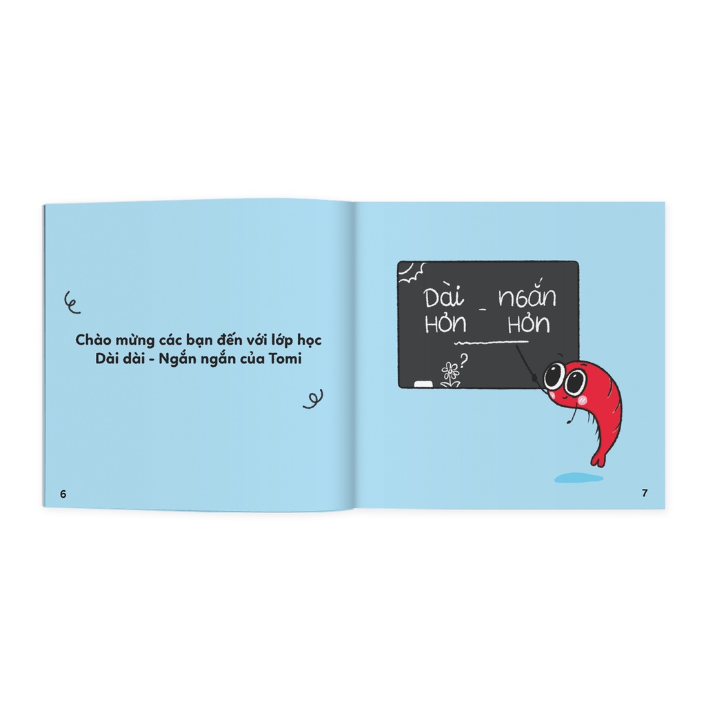 - Trong cuốn sách "dài ngắn" Tomi đóng vai là giáo sư thông thái và mở lớp học Ngắn ngắn – Dài dài. Cậu lần lượt đưa ra các sự vật và đố bố mẹ của mình biết sự vật nào ngắn hơn và sự vật nào dài hơn. Thông qua theo dõi buổi học của Tomi, bé sẽ học được phép so sánh DÀI – NGẮN.