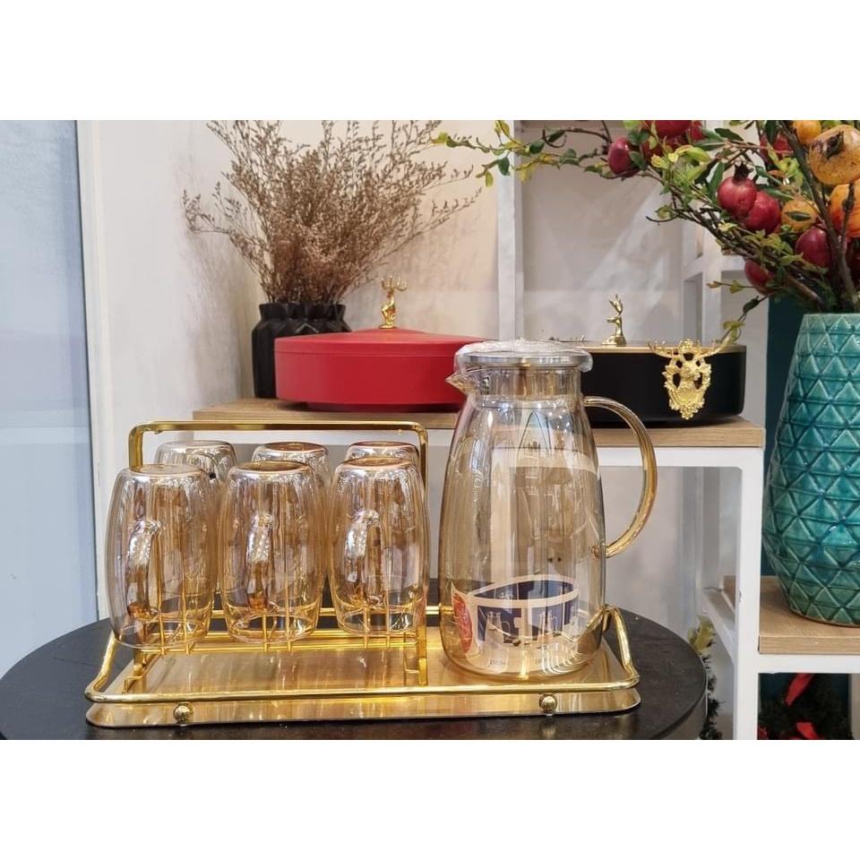 ✨Combo bình đựng nước uống thủy tinh chịu nhiệt cao cấp kèm khay inox mạ vàng, xanh