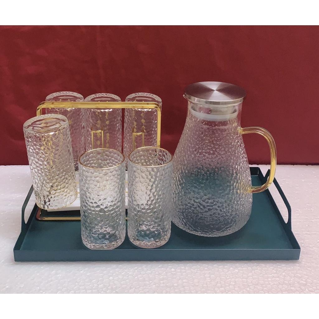 Giá sản phẩm được quy theo các phân loại sau, quý khách vui lòng đọc kĩ các combo phân loại nhé: ️Mô tả: 1 - Bộ combo Gồm 1 bình thủy tinh vân sần 1800ml & 6 cốc thủy tinh + 1 khay kim loại xanh + 1 giá úp cốc kim loại mạ vàng. 2 - Bộ 6 cốc sần nổi viền vàng. 3 - Bình đựng nước uống thủy tinh tháp vân sần 1800ml 4 - Khay kim loại xanh 5- Khay gỗ xanh 6 - Giá úp cốc -Bình dung tích 1800ml. Nắp inox có zoăng cao su, đảm bảo an toàn cho sức khoẻ, thiết kế roong khit nắp chặt không lo bị rớt khi rót cạn nước