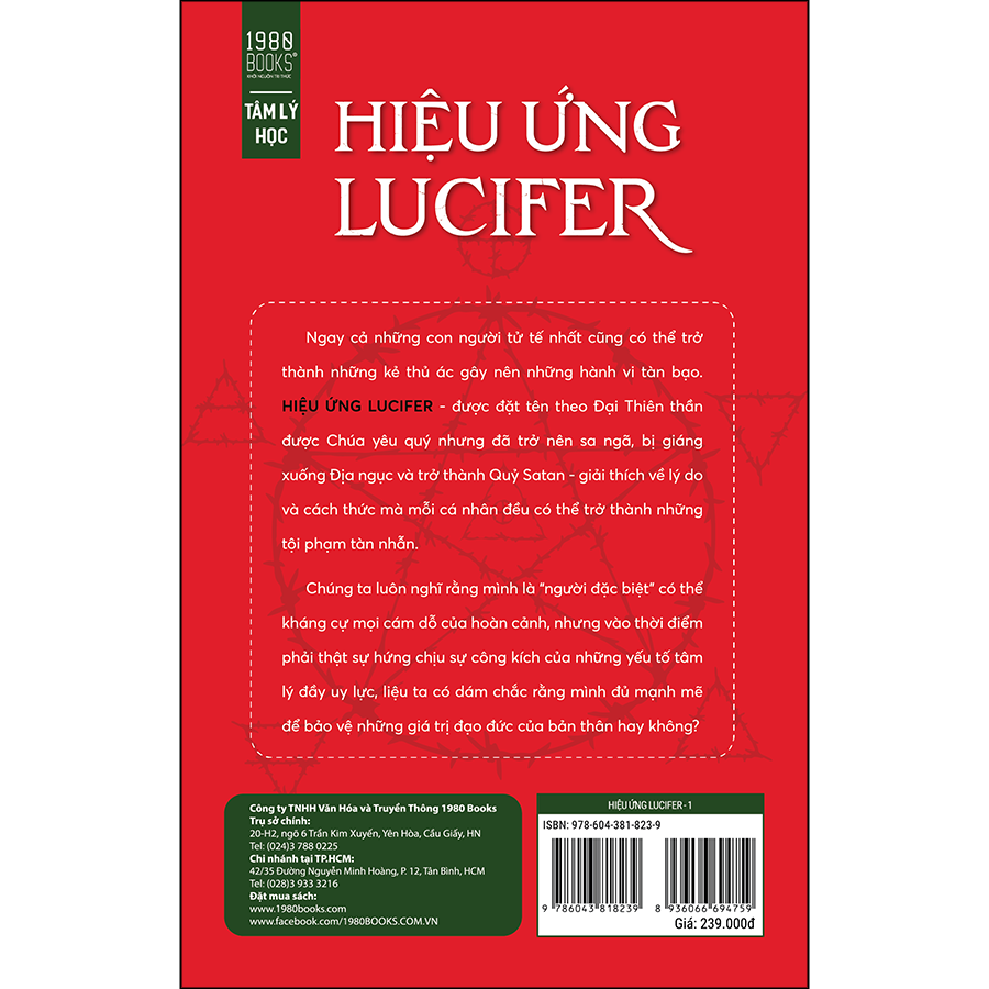 Ngay cả những người bình thường nhất và tử tế nhất cũng có thể trở thành những kẻ thủ ác gây nên những hành vi tàn bạo vượt ngoài luân lý thông thường. Hiệu ứng Lucifer - được đặt tên theo Đại Thiên thần được Chúa yêu quý nhưng đã trở nên sa ngã, bị giáng xuống Địa ngục và trở thành Quỷ Satan - giải thích về lý do và cách thức mà mỗi chúng ta đều có thể trở thành những tội phạm tàn nhẫn. Cuốn sách là bản tường thuật chân thực và chi tiết nhất về thí nghiệm nhà tù Stanford kinh điển do Philip Zimbardo chủ trì thực hiện, bên cạnh việc phân tích nhiều nghiên cứu tâm lý xã hội gây sốc khác và nhìn lại những câu chuyện thực tế kinh hoàng mãi mãi in dấu trong lịch sử.