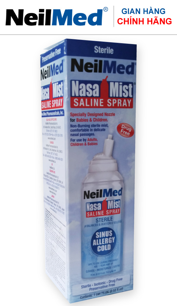 VỀ CHAI XỊT PHUN SƯƠNG NeilMed NasaMist là dạng dung dịch xịt rửa mũi đẳng trương vô trùng dạng phun sương, không chứa chất bảo quản, xịt mọi hướng 360 độ ngay cả khi lộn ngược, rất thuận tiện khi sử dụng, đặc biệt dành cho trẻ em. Thành phần: Sodium Chloride, Sodium Bicarbonate Công dụng: