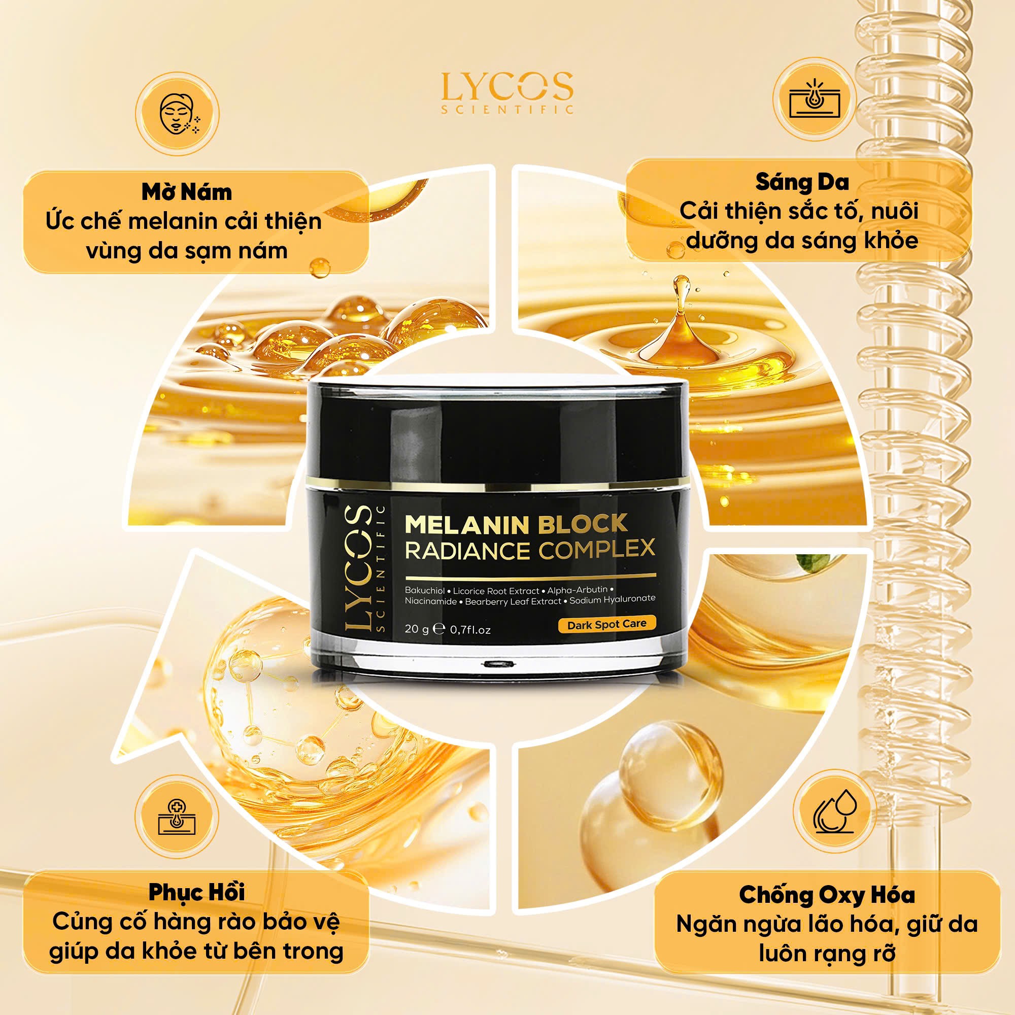 Với công thức độc quyền chất lượng cao, Kem Nám Melanin Block Radiance Complex Lycos sẽ trả lại làn da trắng mịn và giúp da trẻ hoá có sức sống đáng kể, để làm được điều đó KEM NÁM MELANIN BLOCK RADIENCE COMPLEX LYCOS đã mang trong mình 5 loại thảo dược quý hiếm: Chiết xuất rễ cam thảo, Chiết Xuất Rễ Cây Hoa Mẫu Đơn, Chiết xuất dâu gấu, Chiết xuất từ cây oliu và các hoạt chất như Niacinamide, HA, Alpha Arbutin, Salicylic Acid, Glabridin