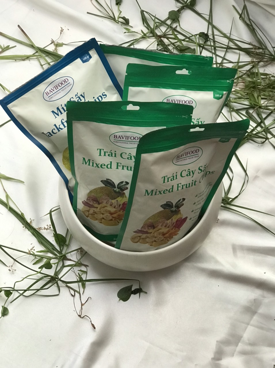 MÔ TẢ SẢN PHẨM Tên sản phẩm: Trái cây sấy chân không - BAVI. Thương hiệu: BAVIFOOD Dòng sản phẩm: Cao cấp - Premium. Phương pháp sấy: Sấy chân không. Thành phần: Mít chín, Chuối chín, Khoai lang vàng, Khoai lang tím, Khoai môn và Dầu thực vật. Đặc tính: Sản phẩm giòn xốp mà vẫn giữ được hương vị thơm ngon, vị ngọt thanh tự nhiên …, màu sắc tươi nguyên và bảo toàn được giá trị dinh dưỡng. Đóng gói: