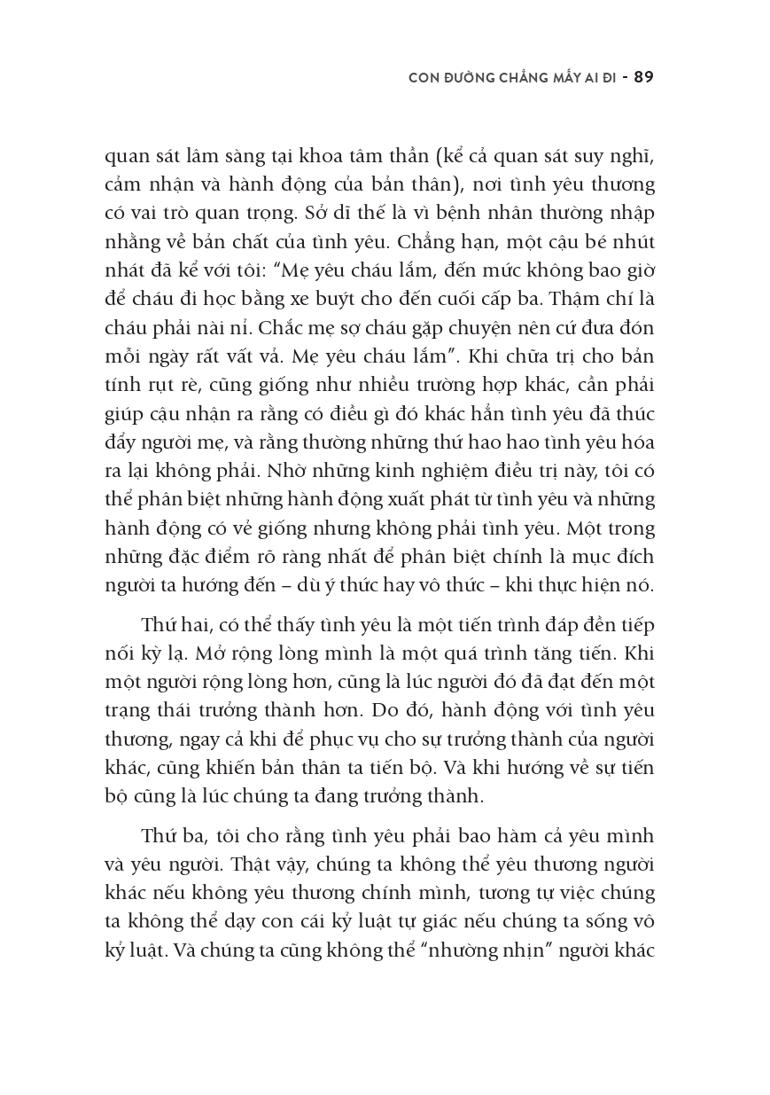 Con Đường Chẳng Mấy Ai Đi là một cuốn sách viết về chủ để Tâm lý, Các tổn thương tâm lý, Tình yêu và Hành trình trưởng thành tinh thần. Cuốn sách cung cấp những công cụ và giải pháp an toàn, thực tiễn và dễ dàng thực hiện, giúp bạn đọc hướng đến một cuộc đời hạnh phúc. Thông qua quá trình trị các bệnh nhân cũng như những trải nghiệm bản thân, tác giả cuốn sách – bác sĩ tâm lý M. Scott Peck, cho chúng ta thấy rằng để có được một cuộc đời hạnh phúc nhất thiết phải đạt được sự trưởng thành về tinh thần. Đây tuy là lối tắt, nhưng lại Con Đường Chẳng Mấy Ai Đi. Cuốn sách này được chia thành bốn phần: Kỷ luật, Tình yêu, Trưởng thành & Tôn giáo và Phước lành.