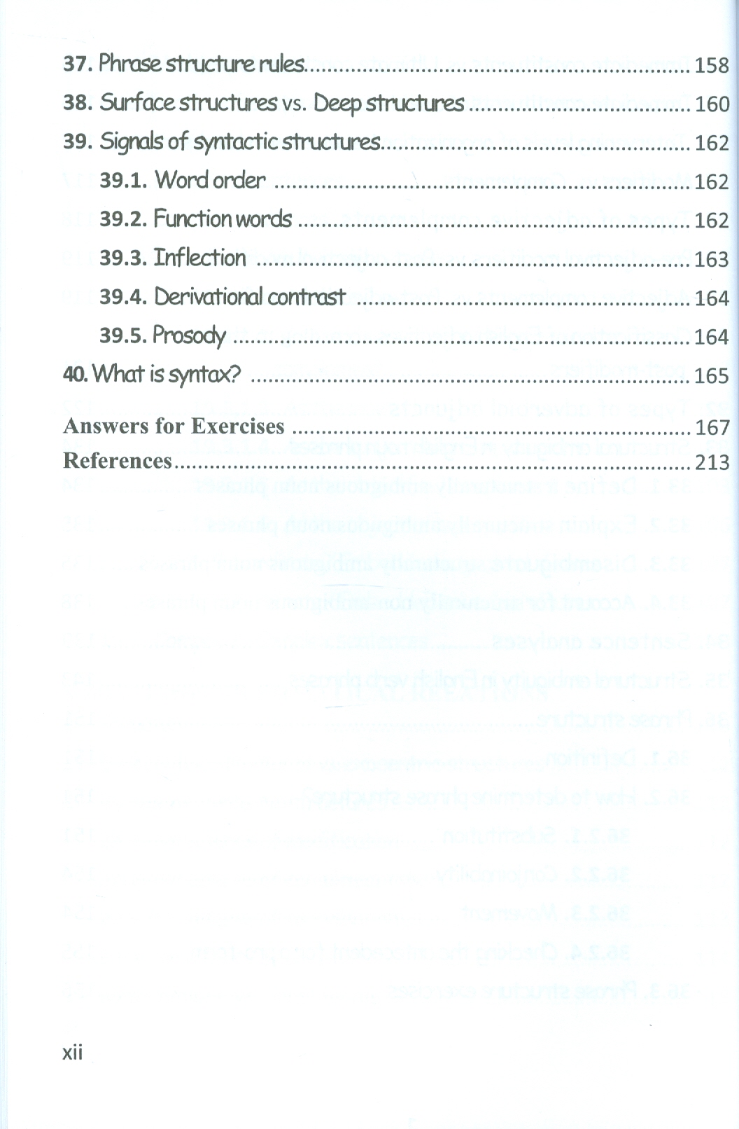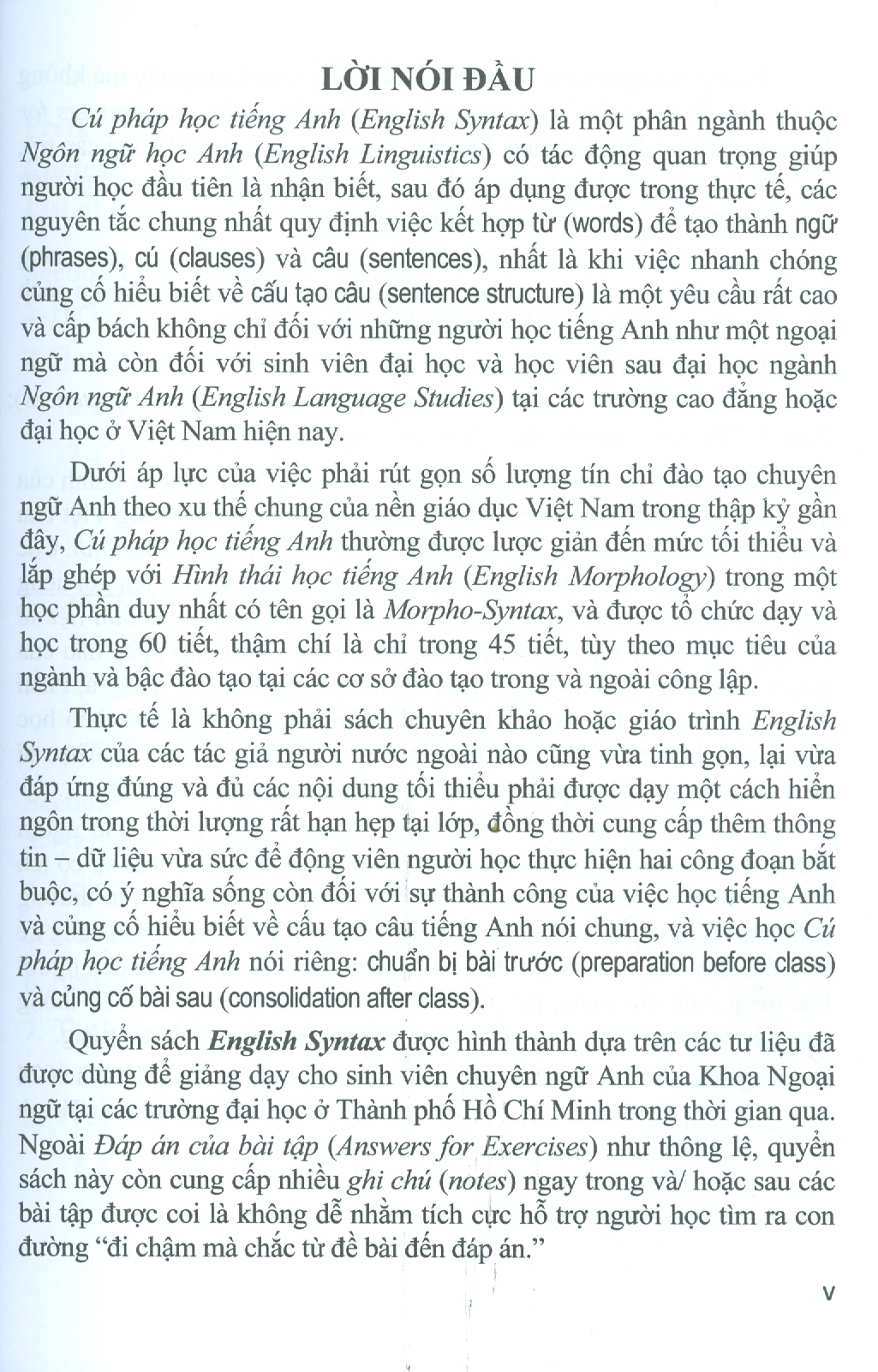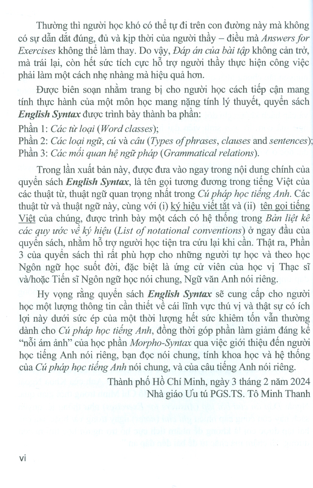 Quyển sách English Syntax được hình thành dựa trên các tư liệu đã được dùng để giảng dạy cho sinh viên chuyên ngữ Anh của Khoa Ngoại ngữ tại các trường đại học ở Thành phố Hồ Chí Minh trong thời gian qua. Ngoài Đáp án của bài tập (Answers for Exercises) như thông lệ, quyển sách này còn cung cấp nhiều ghi chú bằng cả tiếng Anh lẫn tiếng Việt ngay trong phần lý thuyết và/hoặc sau các bài tập được coi là không dễ nhằm tích cực hỗ trợ người học tìm ra con đường "đi chậm mà chắc từ đề bài đến đáp án".