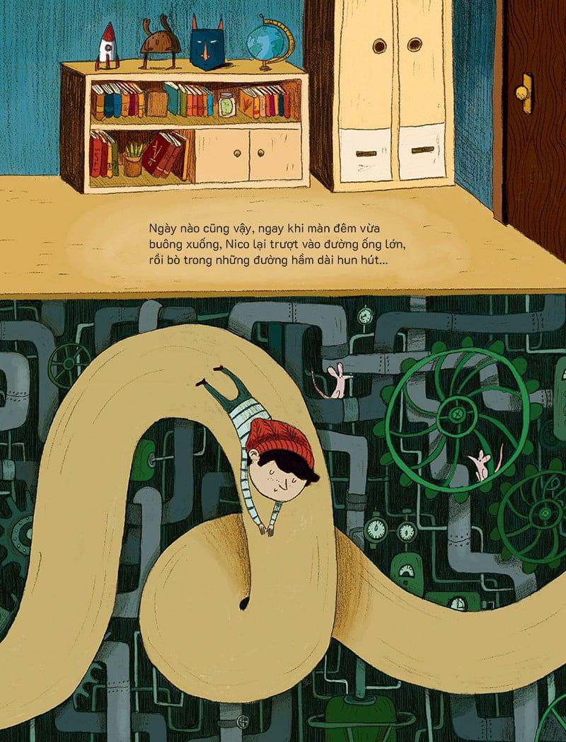 Ngày nào cũng vậy, ngay khi màn đêm vừa buông xuống, Nico lại tới nơi bí mật của cậu: Xưởng Máy. Ở đó có Khỉ đuôi sóc, người bạn chí cốt của Nico. Tối nay, hai bạn chỉnh sửa tỉ mỉ lần chót cỗ máy mới: một cỗ máy đặc biệt dùng để thám hiểm đáy biển.