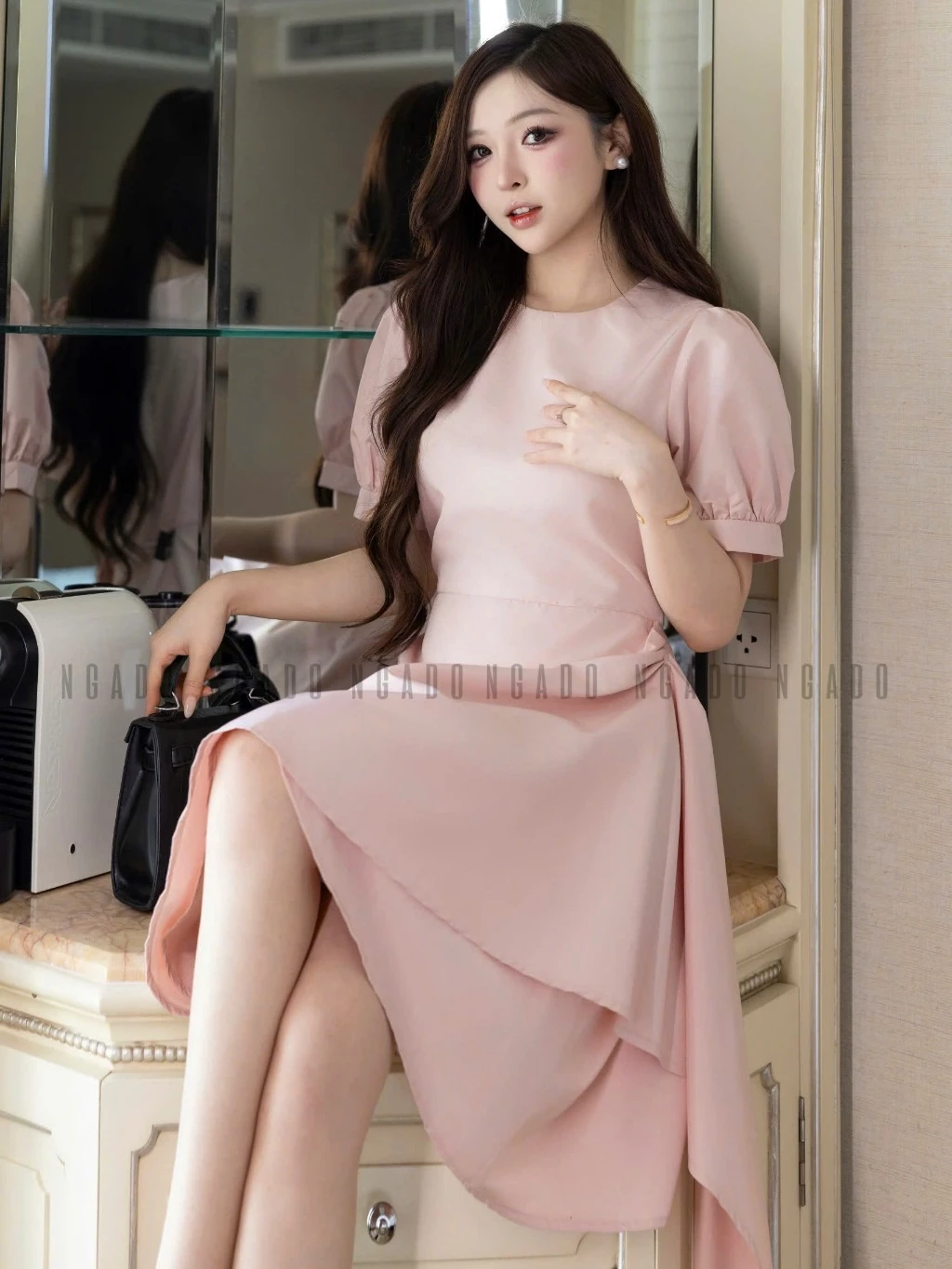✨Đầm hồng cổ tròn NGADO , đầm nữ , Đầm tay phồng , Đầm dự tiệc sang chảnh