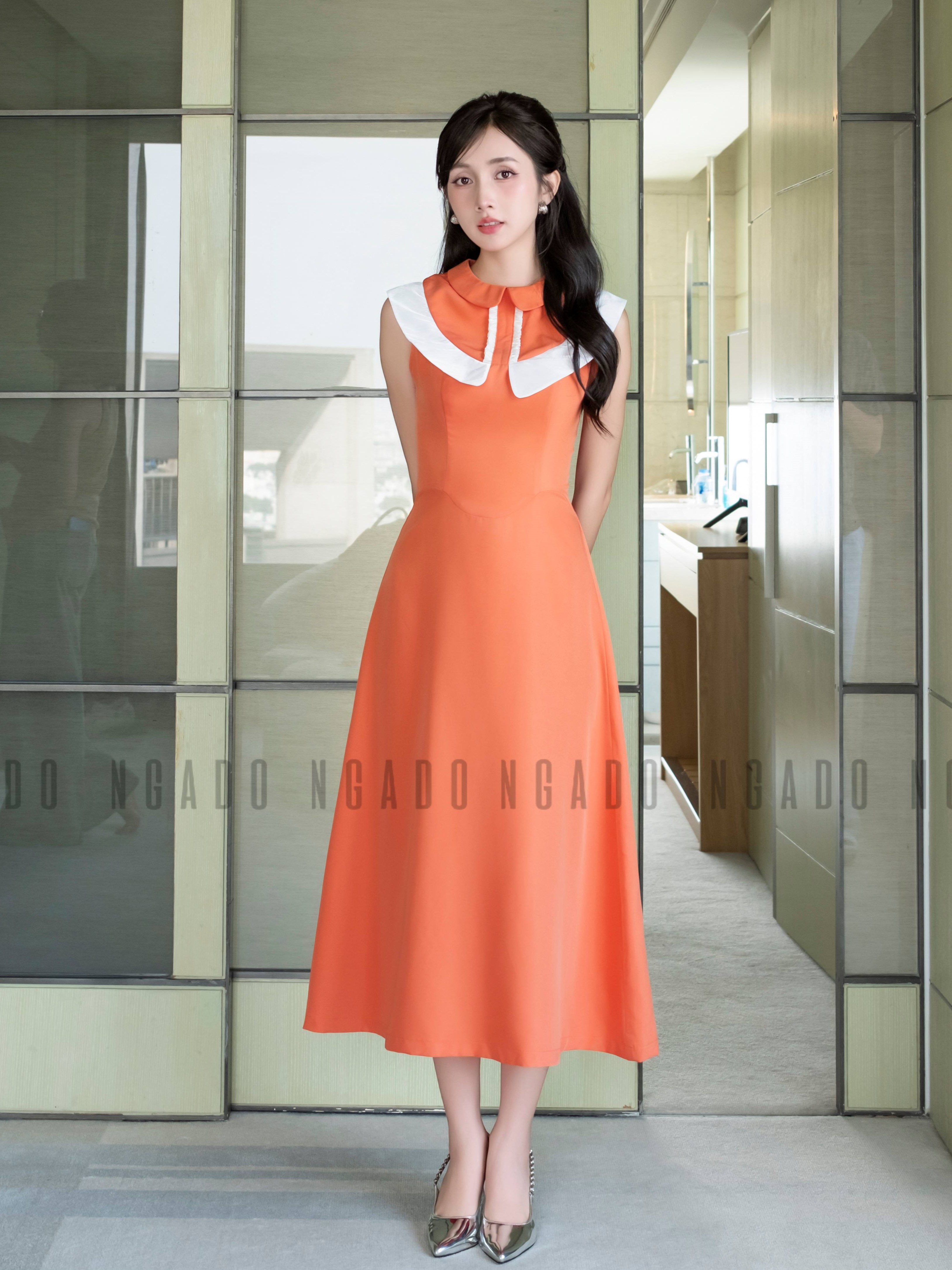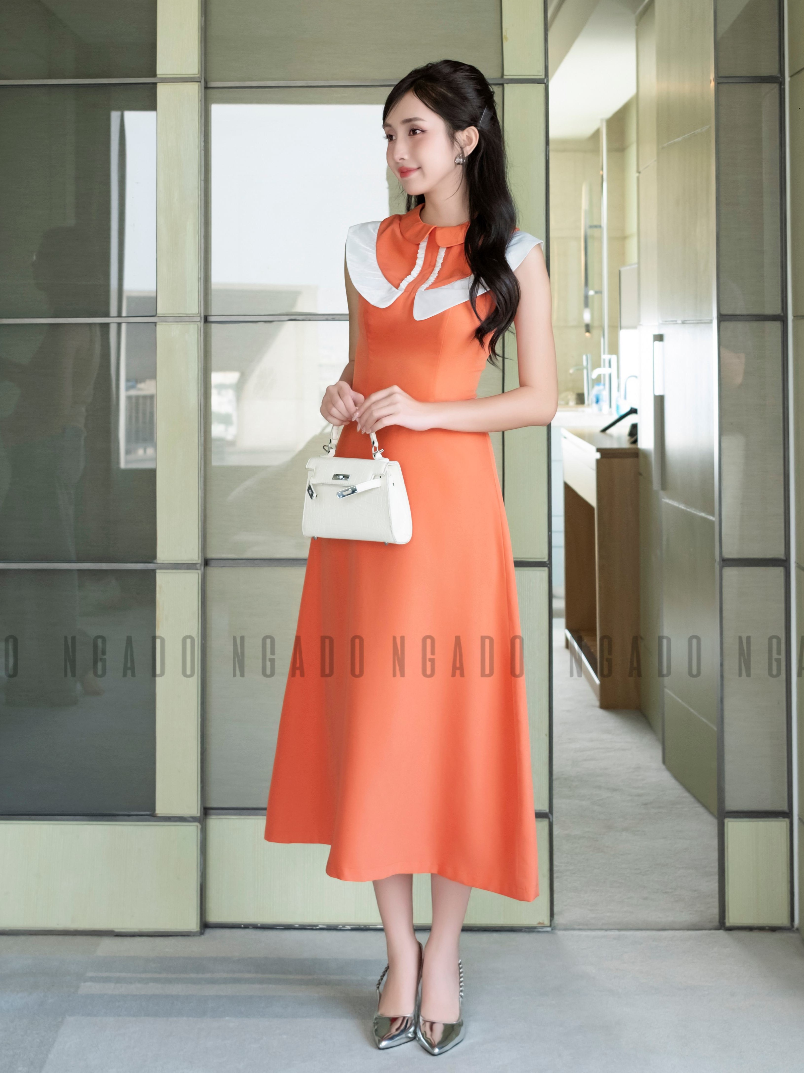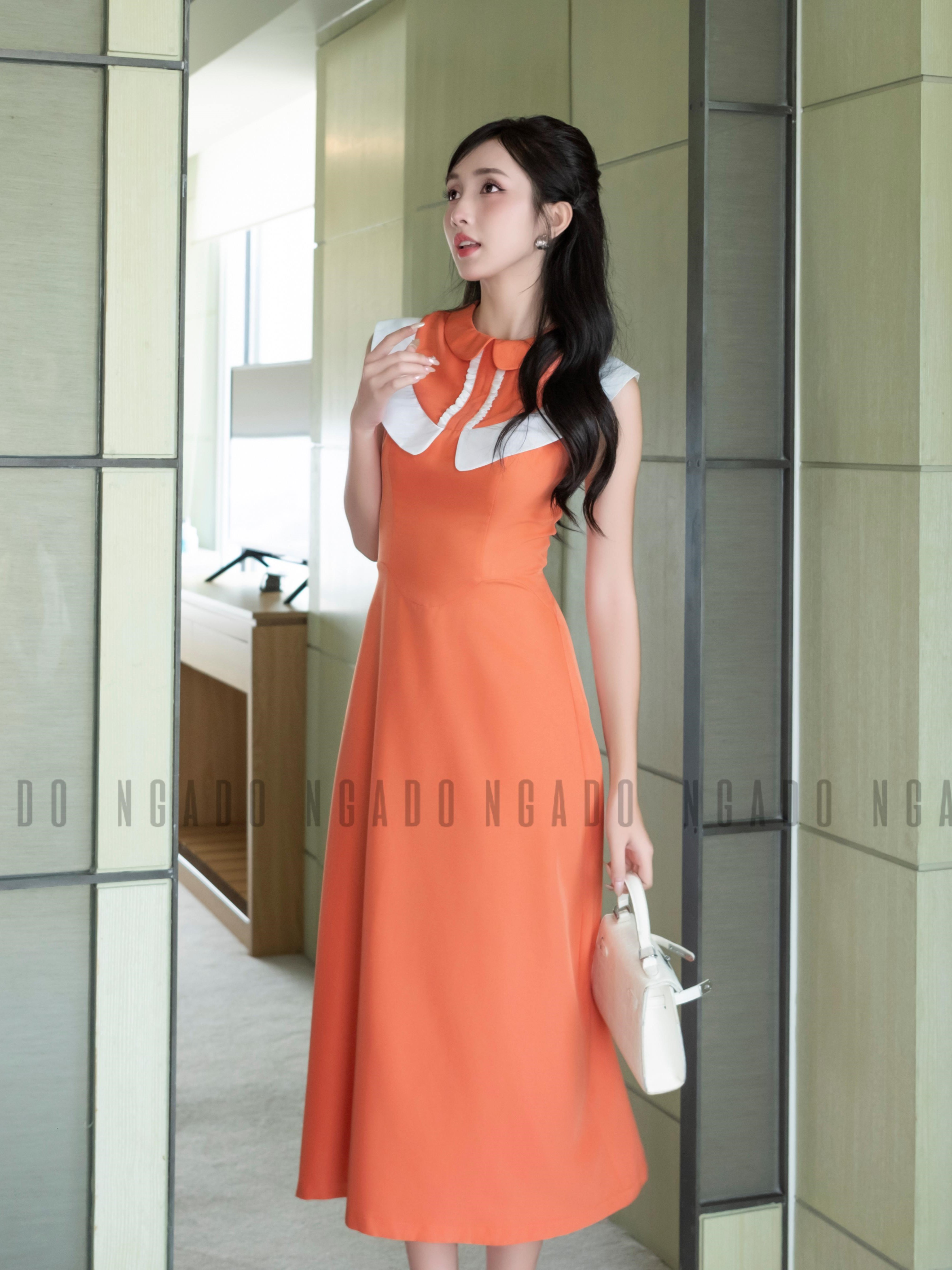 ✨Đầm cam cổ sen phối trắng NGADO, đầm dự tiệc , đầm dạo phố