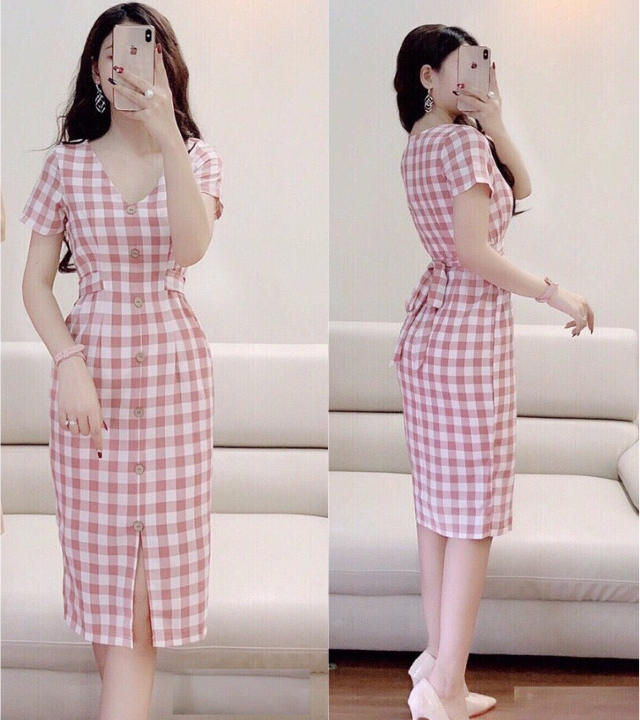 [ 175k ] Đầm kẻ ca rô thắt nơ eo