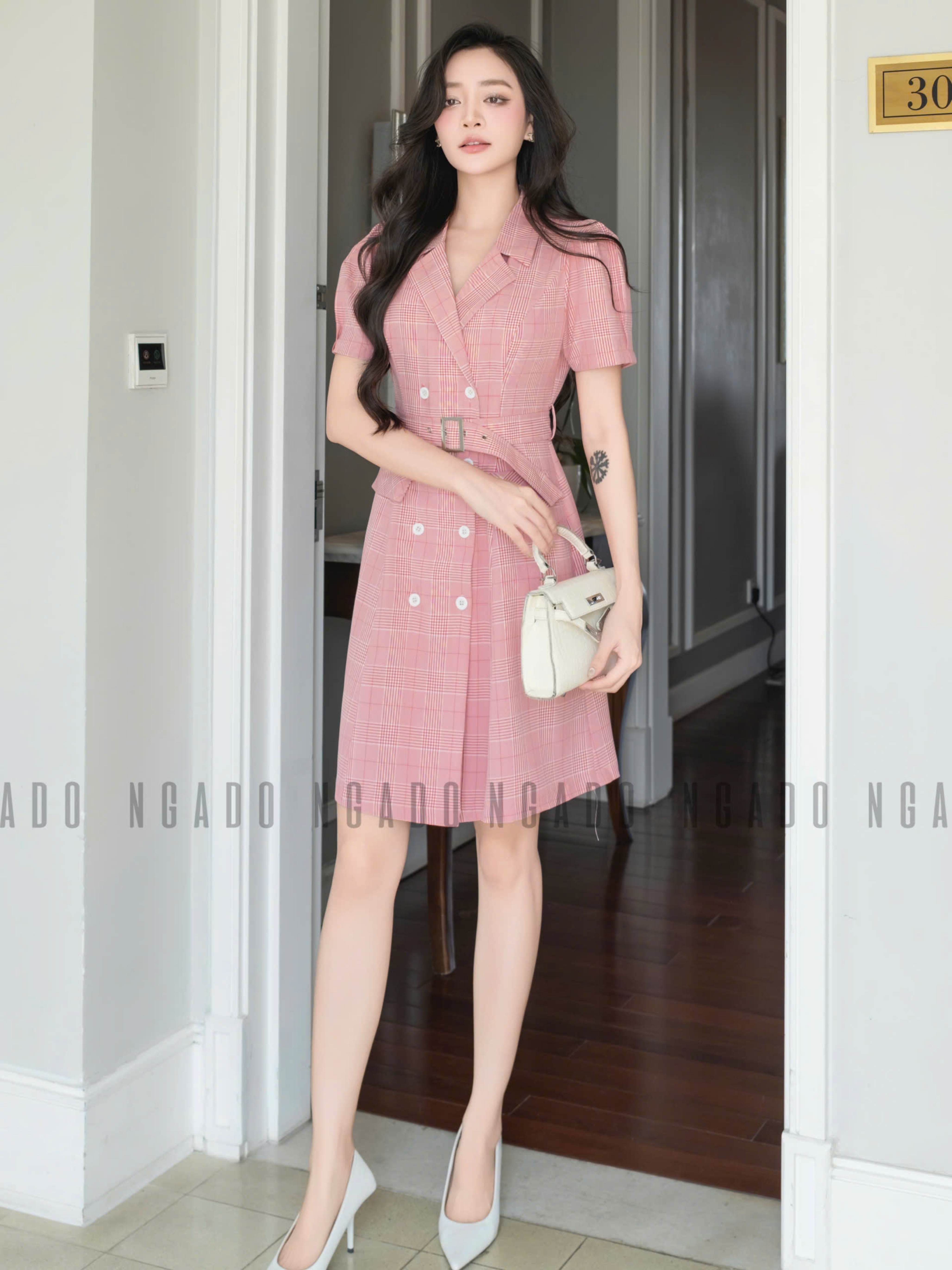 ✨Đầm caro hồng cổ vest NGADO , đầm caro , đầm kiểu , đầm công sở