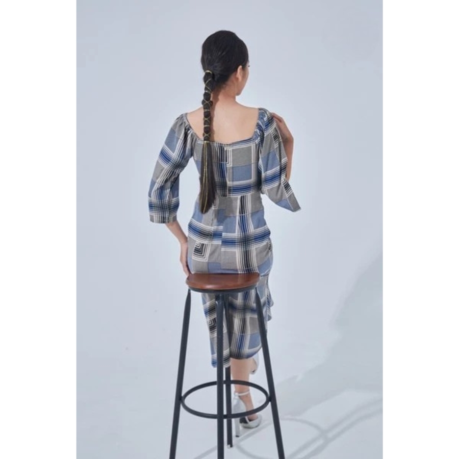 Đầm lụa caro dáng ôm, cỗ chữ V, viền chun dài từ ngực đến hông, tay áo dài cách điệu xẻ.