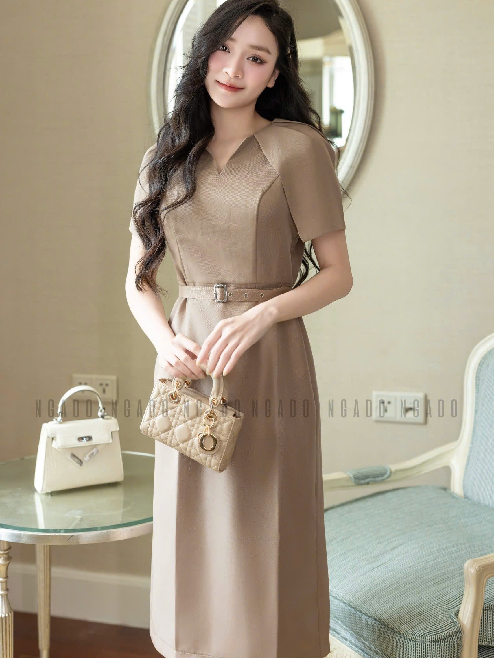 ✨Đầm nâu tay xếp ly NGADO , đầm công sở , đầm dự tiệc
