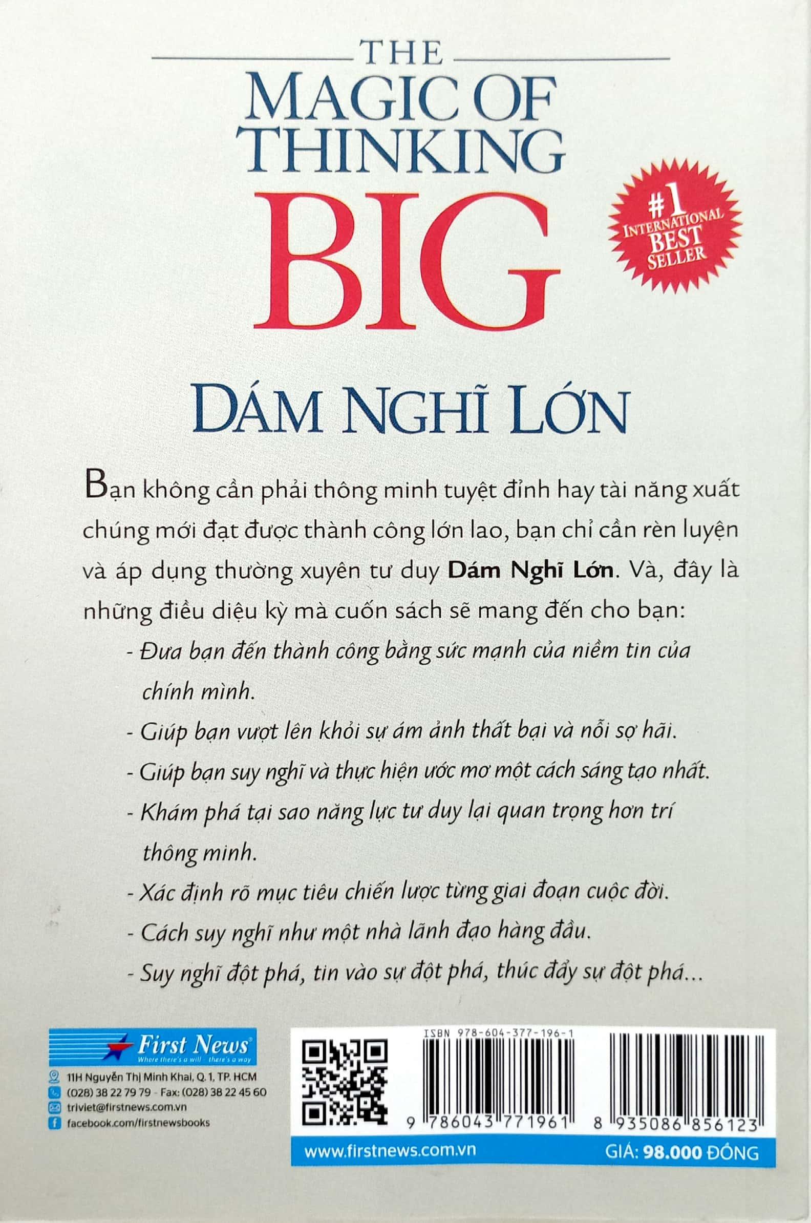 Dám Nghĩ Lớn! Hãy thử nghĩ về những người có mức thu nhập cao hơn bạn gấp 5 lần. Có phải họ thông minh hơn bạn gấp 5 lần? Họ làm việc vất vả hơn bạn gấp 5 lần? Nếu câu trả lời của bạn là “không” thì bạn sẽ chạm đến câu hỏi này: “Vậy, họ có những đức tính, phẩm chất hay bí quyết gì mà tôi không có?” Qua quyển sách đã được bán ra hơn 4 triệu bản trên khắp thế giới, Tiến sĩ David J. Schwartz, sẽ giải đáp cho bạn lý do tại sao họ lại khác với chúng ta, đó là: Họ dám nghĩ lớn hơn chúng ta gấp 5 lần! Dám Nghĩ Lớn! giới thiệu đến bạn một phương pháp tư duy đơn giản nhưng hiệu quả đến kỳ diệu. Quyển sách này trình bày một cách sinh động và dễ hiểu tiến trình giúp bạn đạt được sự mãn nguyện cao nhất trong nghề nghiệp, trong cuộc sống gia đình và trong cộng đồng của bạn. Bạn không cần phải thông minh tuyệt đỉnh hay tài năng xuất chúng mới đạt được thành tích lớn lao, bạn chỉ cần rèn luyện và thực hành thường xuyên thói quen dám nghĩ lớn. Những hướng dẫn đơn giản mà tác giả đưa ra trong cuốn sách không phải là những lý thuyết chưa được kiểm nghiệm. Đó không phải là sự phỏng đoán và ý kiến của một người. Mà đó là những cách tiếp cận với vô vàn tình huống của cuộc sống đã được chứng minh, trở thành những hướng dẫn có thể áp dụng phổ biến và tạo ra tác dụng kỳ diệu. Đọc và suy ngẫm những nội dung được chia sẻ trong cuốn sách là bạn đã thành công được một nữa rồi, phần còn lại là những suy nghĩ và hành động của bạn. Từng bước, từng bước một cuốn sách sẽ dẫn dắt bạn đến thành công vượt bậc bằng sự tự tin, thấu hiểu bản thân và biết cách nâng tầm suy nghĩ của chính bạn theo cách nghĩ của những người quan trọng. Cuốn sách thực sự cần thiết với những hướng dẫn giúp bạn xây dựng diện mạo của bản thân một cách tốt nhất, từ trang phục bề ngoài đến cả suy nghĩ, lòng tự tin bên trong và cả năng lực tư duy đột phá của chính bản thân bạn. Cuốn sách có chen lẫn những phần trắc nghiệm, những bảng hướng dẫn ngắn gọn về các mục tiêu bạn sẽ đạt được theo từng mốc thời gian ngắn dài khác nhau. Với Dám Nghĩ Lớn!, bạn sẽ sống tự tin hơn, giàu có hơn, hạnh phúc hơn, đạt được những thành tựu to lớn, kiếm được nhiều tiền, có nhiều bạn và được mọi người tôn trọng. Bạn sẽ hiểu tư duy táo bạo mang đến điều kỳ diệu cho bạn như thế nào. Hãy bắt đầu với câu nói của nhà hiền triết vĩ đại Disraeli: “Cuộc đời thật ngắn ngủi, do vậy, đừng sống nhỏ nhoi.”