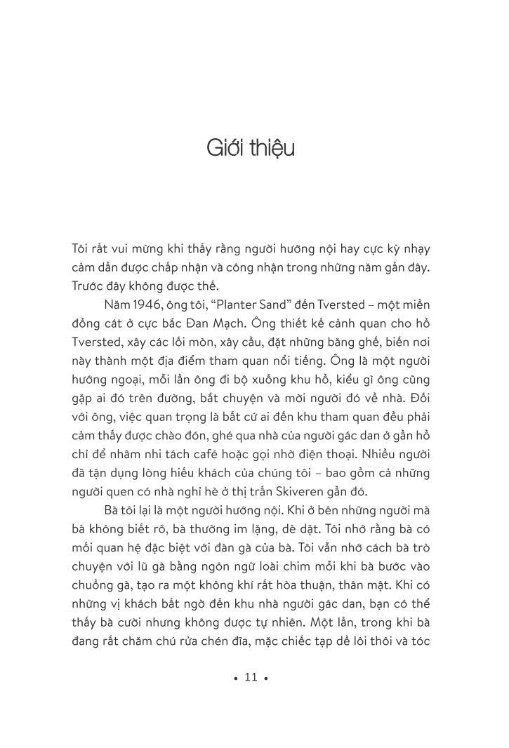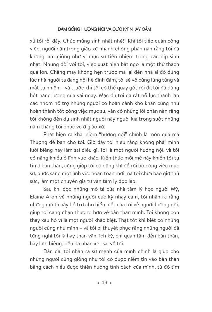 Dám sống hướng nội và cực kỳ nhạy cảm là tác phẩm đúc kết nhiều năm tháng làm mục sư và chuyên gia tư vấn tâm lý của Ilse Sand. Nhưng trên hết, nó là trải nghiệm của một người hướng nội đã thoát ra mặc cảm để tìm thấy niềm vui sống và phát huy hết những năng lực mà tính cách hướng nội của mình mang lại.