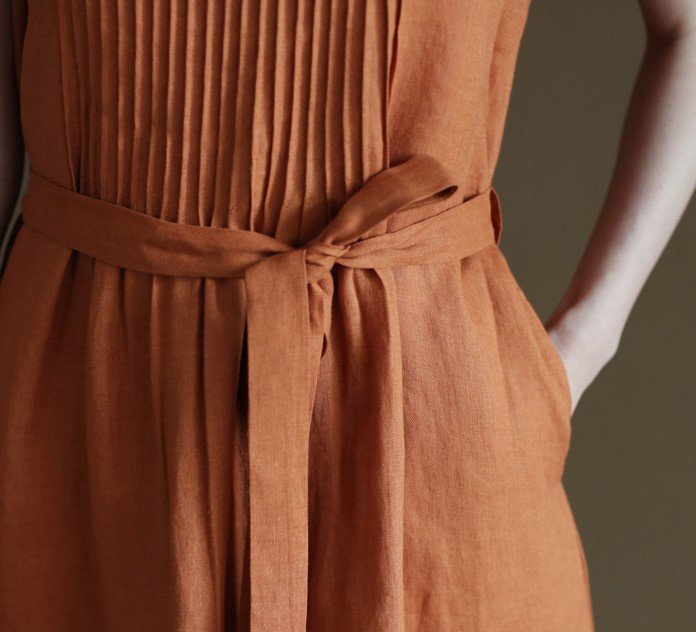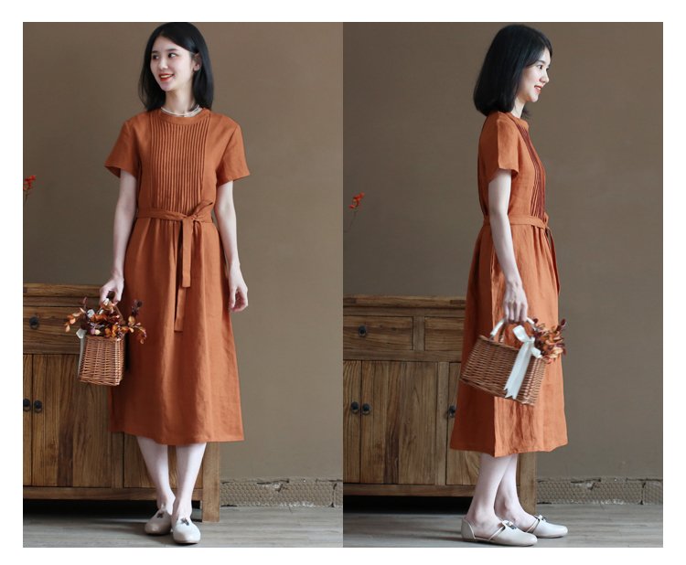 ✨Đầm suông linen nữ cổ tròn kín đáo, đầm có túi chéo tiện lợi, kèm dây thắt eo xinh NH191 cam